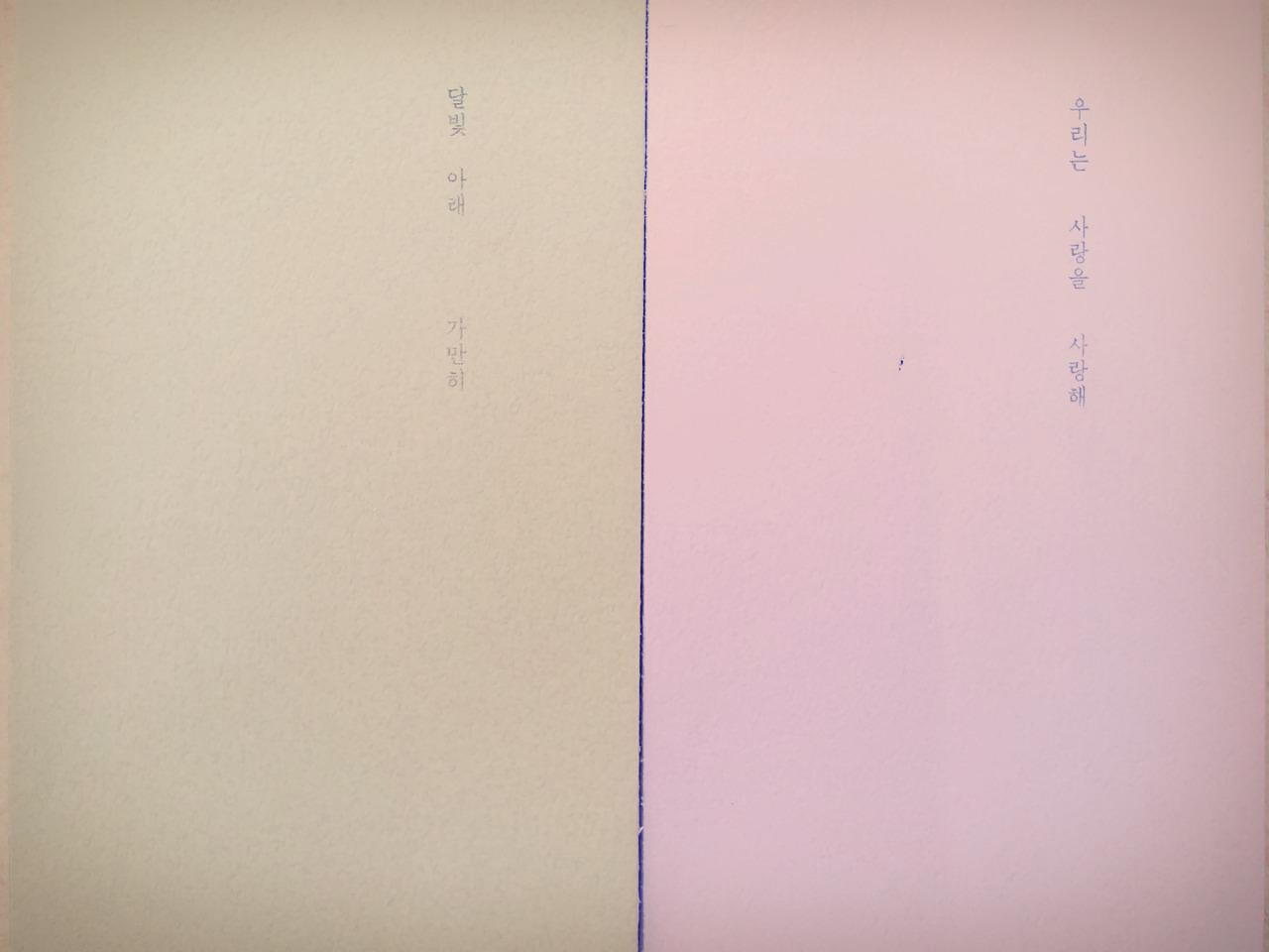 짝수 쪽에는 글씨가 전혀 없고, 홀수 쪽에만 약간 활자가 있었다. 얼빠진 표정을 짓자 아내는 김종완 씨가 만든 <달빛 아래 가만히>와 <우리는 사랑을 사랑해>를 배송비까지 15000원 주고 샀다고 했다. 그러니까 메모장이 아니라 책이라는 의미였다. 이런 책은 나도 만들겠다고 했다. 아내는 깔깔 웃으며 "책을 우습게 안다고" 콧방귀를 뀌었다. 놀라운 건 사전적인 의미로 김종완 씨가 글부터 디자인, 제본까지 직접 다 했다는 사실이었다.