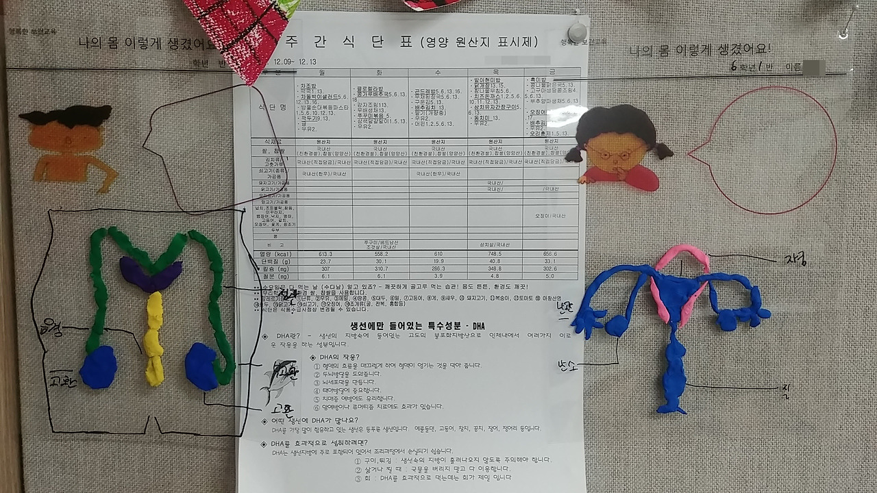 교실에 들어와 보니 게시판에 낯선 교육자료가 붙어 있었다. 알싸한 기운이 뇌리를 스쳐 지나갔다. 생식기다! 아니나 다를까 주간 식단표를 가운데 두고 여성 생식기 모형과 남성 생식기 모형이 양 옆에 자리하고 있었다.