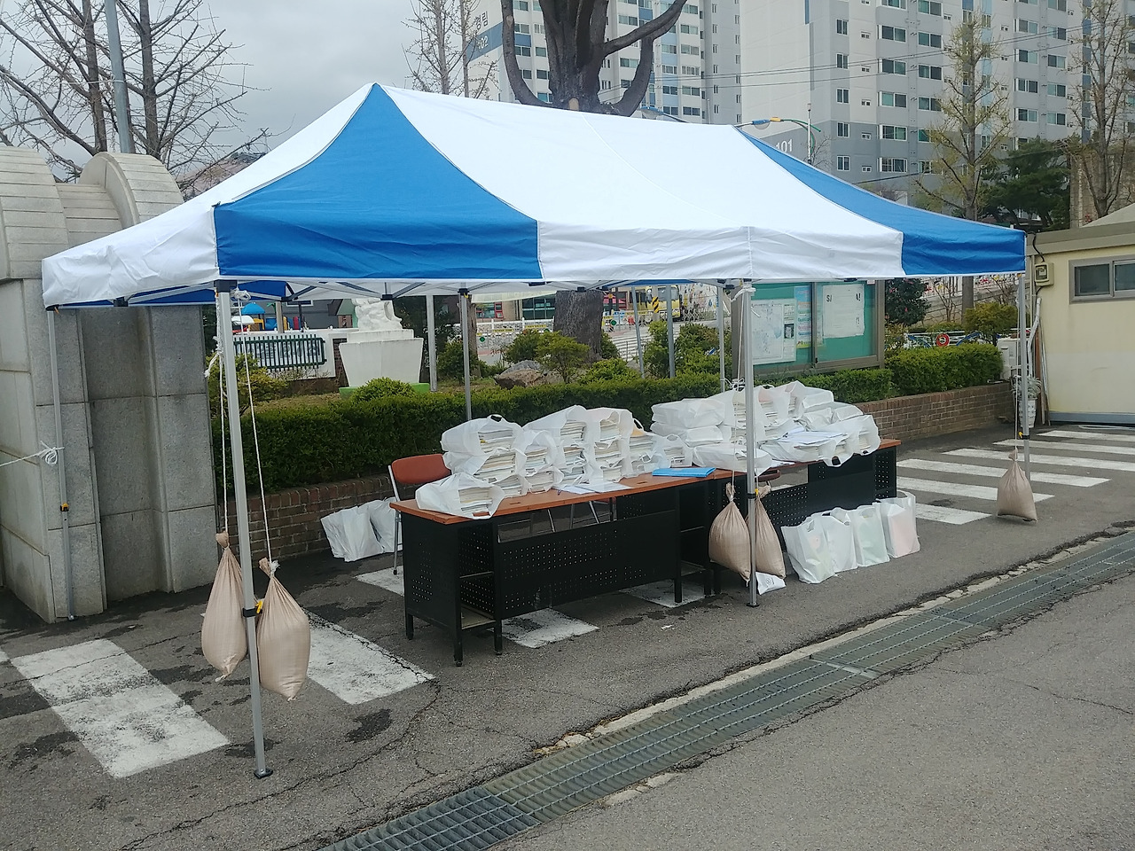수레를 끌고 교문으로 갔다. 처음 보는 천막이 서 있었다. 천막 아래에는 긴 책상 두 개와 의자가 우리를 반겨주었다. 스포츠 강사님과 운동부 코치님들이 설치해 주신 작품이었다. 비가 조금씩 내렸고 바람이 세찼다. 빗방울은 천막이 막아주었고, 기둥마다 걸린 두 개의 모래자루가 바람에 날리는 천막을 붙잡았다. 그러는 사이 학부모님들이 걸어서 또는 차를 타고 교과서를 받아가셨다. 택배차와 점심 배달 오토바이가 중간중간 교문을 넘나들었고, 쓰레기 수거 트럭이 숨죽이며 지나갔다.