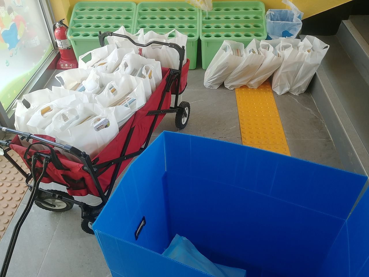 교과서 나눠 주는 게 일이 될 줄이야. 교실이었으면 애들 한 줄로 세워 가져가기만 하면 되는데, 이걸 일일이 나눠주려니 품이 든다. 아이가 가져가야 할 교과서는 총 16권. 방역을 위해 외부인이 학교 건물에 들어올 수는 없다. 하는 수 없이 교과서를 하나하나 포장하고 짐수레에 실어 교문 앞 천막까지 날라야 한다. 교과서 수량을 세고 있는데 똑똑 누가 교실 뒷문을 두드렸다. 급식실 조리사 분이셨다.