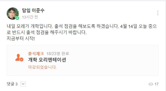 출석 점검을 한다. 선거가 끝나면 바로 온라인 개학이니 오리엔테이션을 겸해 시험 삼아 돌려보는 것이다. 오전 일찍 출석 게시글을 올렸다. 마감시간은 오후 11시 30분. 첫 시도인 만큼 전원 출석을 목표로 하여 마감시간을 넉넉히 넣는다. 적어도 글을 올릴 당시의 판단에는 넉넉하다고 생각했다.