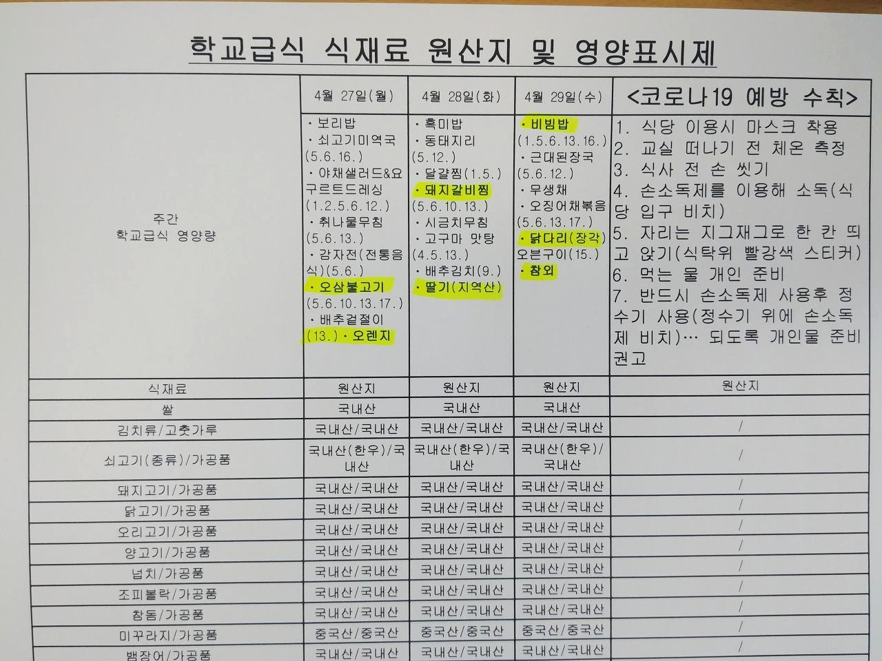 바깥 음식으로 허기를 달랜 지 언 두 달. 복음이 내려왔다. 4월 27일부터 급식 재개, 영양 선생님 쪽지를 읽자마자 환호성을 질렀다. 누가 보면 코로나19가 종식된 줄 알았을 것이다. 곧장 식단표를 인쇄했다. 프린터가 토해낸 따끈따근한 종이를 깔고 형광펜을 쥐었다. 얼마만의 메뉴 탐색인가. 책 목차를 훑듯 전체 메뉴를 스캔한 뒤 세부 메뉴로 넘어간다. 역시 만족스럽다. 5대 영양소 치우침 없이 꽉 찬 식단이다.