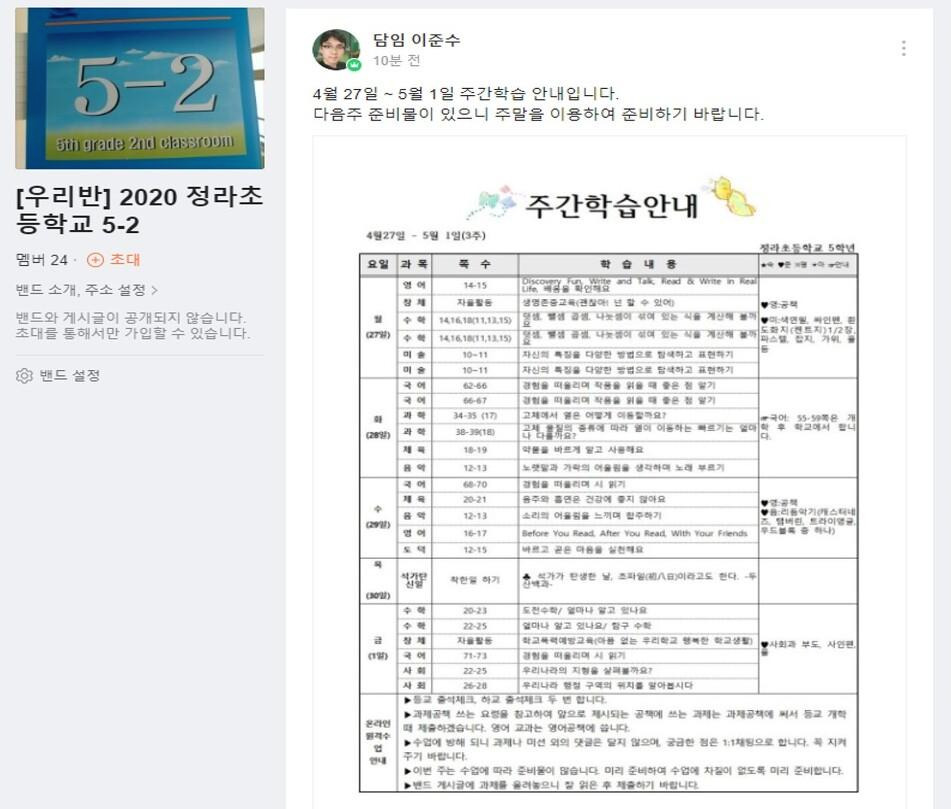 현재 네이버 밴드에 개설된 사이버 학급은 오프라인 학교와 운영 시스템이 같다. 매주 금요일 주간 학습 안내장이 나간다. 요일별, 시간별 과목과 학습내용이 나와 있고 준비물을 함께 소개한다. 수업 영상과 과제는 학교 시정표와 동일한 시각에 올라온다. 쉬는 시간도 다르지 않다.