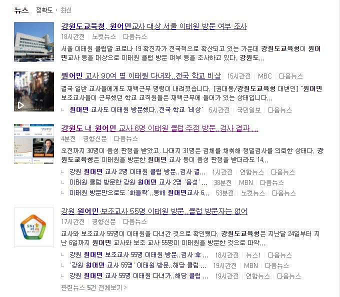 동해시 관내 외국인 원어민 교사 6명이 5월 연휴 기간 이태원을 방문했다. 결론부터 말하면 클럽에는 가지 않았고, 66번 환자의 동선과 겹치지 않았으나 해당 원어민이 소속된 학교 선생님들 모두가 자택 근무에 들어갔다. 논란이 된 것은 자택 근무 중인 교사가 자녀를 어린이집에 보냈기 때문이었다. 원어민은 전원 음성 판정을 받았고, 해당 교사도 직접적으로 원어민과 접촉하지 않았다.맘카페에서 만신창이가 된 선생님은 법적으로 자가격리 대상자가 아니므로 자녀까지 데리고 있을 의무는 없다. 그러나 카페 여론은 살벌했다. 물론 등교 개학을 앞두고 예민한 시기인 만큼 반감이 생길 수도 있다. 참기 힘든 건 원어민 교사와 학교, TALK 장학생(해외동포 대학생이며 보조교사)을 싸잡아 비난하는 카페 분위기와 굳이 공론장에서 해당 교사를 들먹이며 물어뜯는 행태였다.