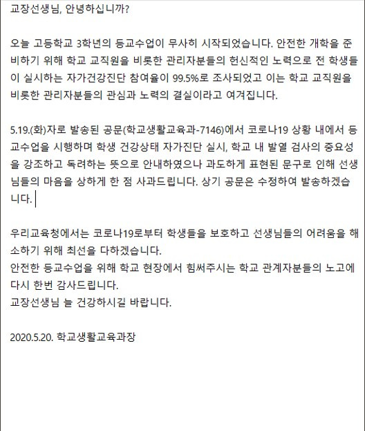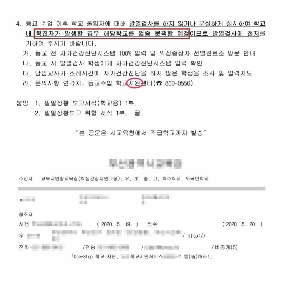 "등교 수업 이후 학교 출입자에 대해 발열검사를 하지 않거나 부실하게 실시하여 학교 내 확진자가 발생할 경우 해당 학교를 엄중 문책할 예정이므로 발열검사에 철저를 기하여 주시기 바랍니다."