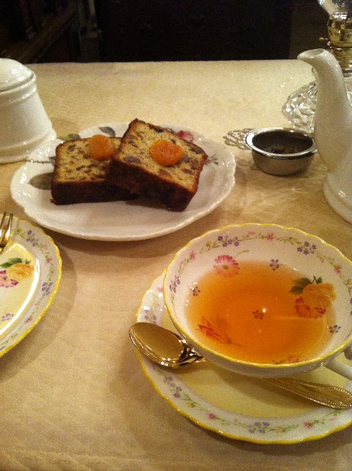 3호점 클로리스 티 캐디. 노리다케 찻잔에 담긴 홍차와 파운드 케이크.