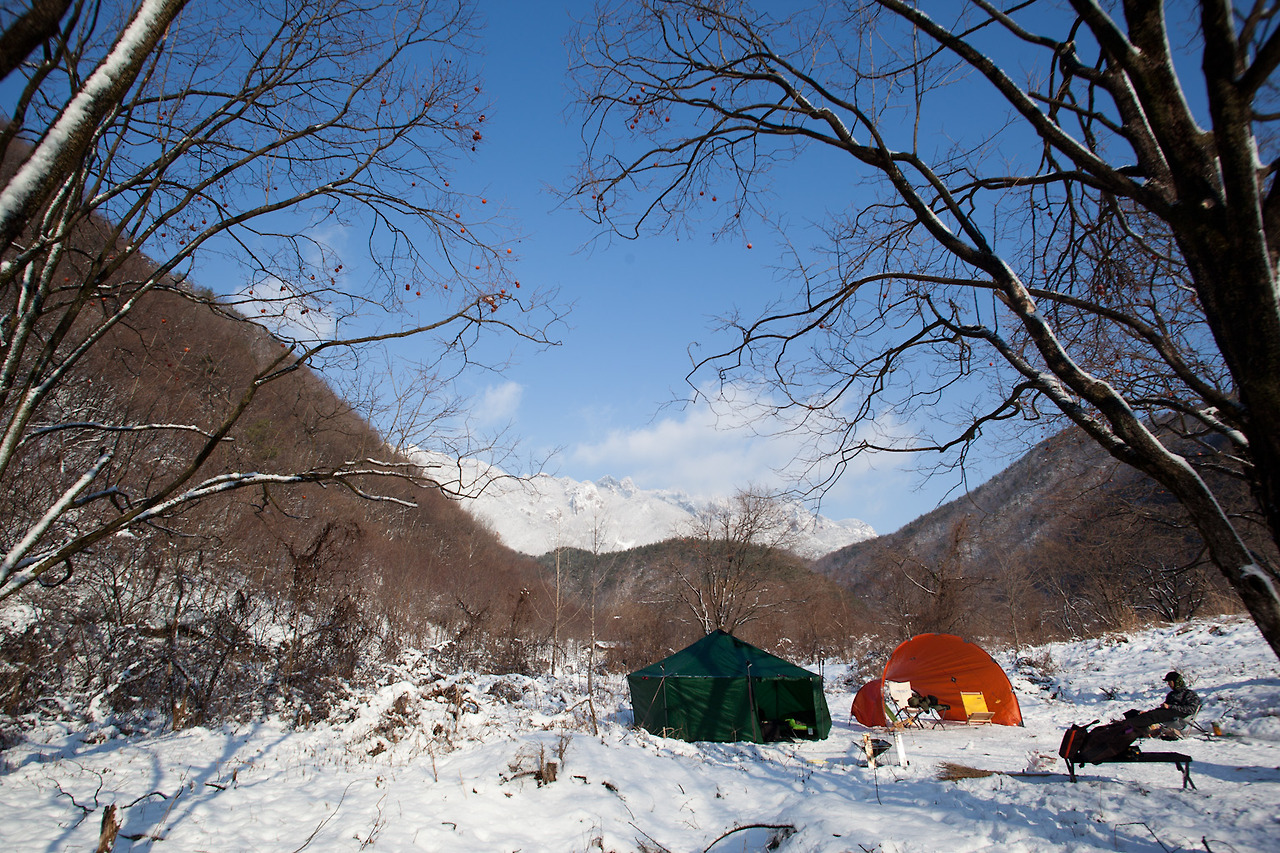 간밤에 우리가 먹다 남긴 음식을 눈독 들였을까. 자고 일어나니 캠프 사이트 주변은 오랫동안 망설인 금수의 발자국들로 어지러웠다. 야영을 하는 사흘 동안 두메산골의 겨울은 여전히 춥고 어려웠다. 잃어버리고 부러진 장비가 여러 개였다. 숲의 신은 우리를 편하게 두지 않았다.