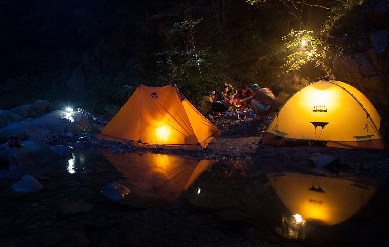 소소리 높은 나무들은 저만치부터 무성했다. 바위의 표면에는 손가락이 긁고 지나간 듯 줄금이 희미하게 새겨져 있었다. 적어도 허리춤까지 물이 흐르던 길이다. 영동지방의 계곡은 경사가 급하고 유속이 빠른 만큼 수량이 급변하는 특징이 있다. 몇 주째 가뭄으로 바위가 드러나고 모퉁이 안쪽마다 조그만 모래 바닥이 생겨난 것이다. 일행들이 먼저 자리를 잡자 더 이상 공간이 없었다. 나는 하는 수 없이 비박을 해야 했다. 큰 바위들이 굴러 내려오다 더 큰 바위를 만나 차례로 멈춰 선 곳 아래에 얇은 매트리스를 깔고 침낭 속으로 들어갔다. 간간이 피부가느낄 수 있을 정도로 비가 내렸다. ‘지금이라도 텐트로 들어가야 하나?’ 고민하다 왠지 모를 지금의 긴장감이 좋아서 그냥 있기로 했다. 수력 발전소처럼 소리를 전기에너지로 변환할 수 있다면 아마도 여름이 가장 좋은 계절일 것이다.