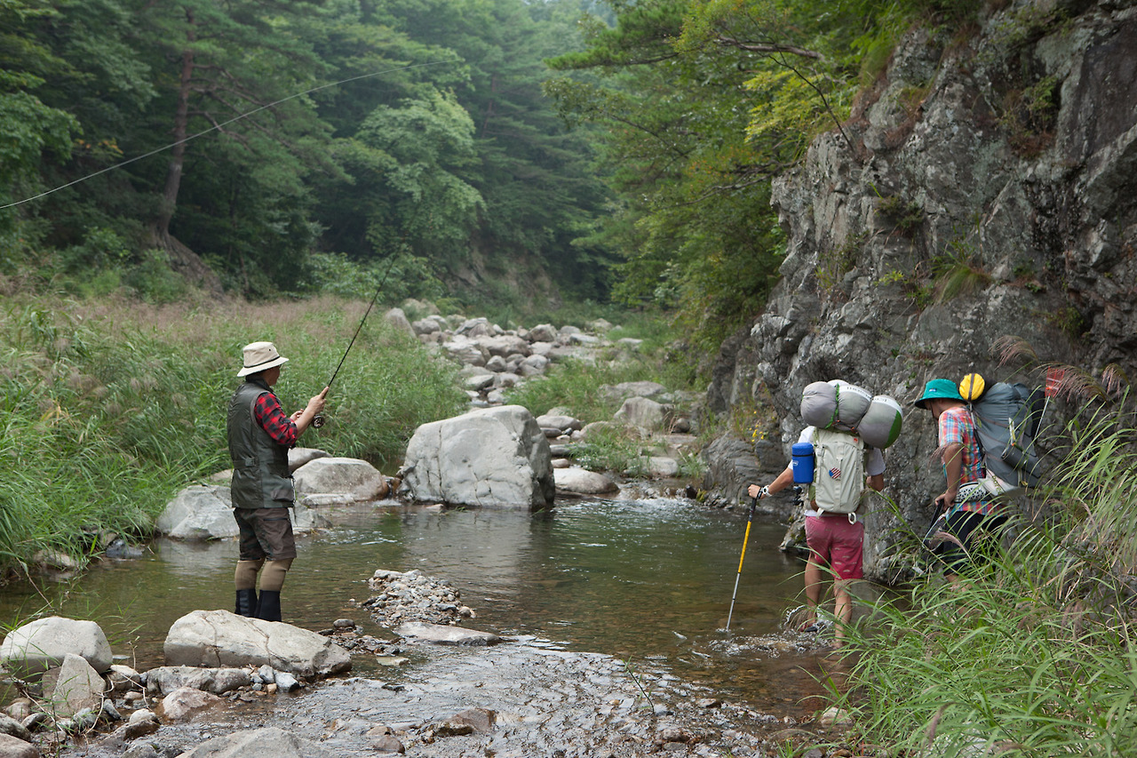 앞서가던 김진영 선배가 뒤따르던 일행의 가슴을 손바닥으로 슬쩍 민다. 걸음을 멈추고 물러서 기다리라는 의미다. 배낭에 묶어두었던 낚싯대를 꺼낸다. 곧이어 플라이를 달고 릴에서 빠져나간 라인이 떠올랐다. 햇살을 잔뜩 머금은 허공을 앞뒤로 가르기 시작한다. 비행기가 지나간 다음 생기는 비행운처럼 급류 위를 가볍게 부유하던 줄과 훅이 수면위에 조용히 내려앉았다. 급하지도 느리지도 않은 물위를 따라 내려가다가 일순간 수면 아래로 빨려 들어간다. 물고기가 잡힌 것이다. “계류에 서식하는 어종은 굉장히 예민하고 민첩해서 낮은 포복으로 다가갈 정도야. 포인트를 포착했다면 그만큼 조용히 준비해야 해.” 그제서야 김 선배가 입을 연다.