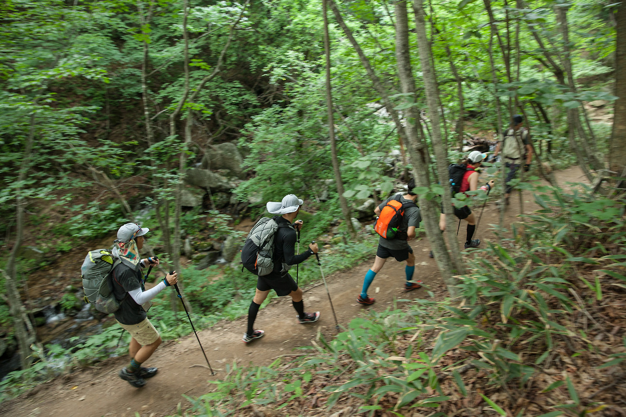 우리는 이곳을 패스트 패킹(Fast Packing)으로 여행하기로 했다. 패스트 패킹은 트레일 러닝과 라이트 하이킹이 결합된 형태다. 라이트 하이킹이 야영 장비의 경량화를 통해 장거리 트레킹을 가능하게 했다면 패스트 패킹은 ‘속도와 달리기’의 개념이 추가된 것이다. 패스트 패킹은 능선을 따라서 달리다가도 해 가 지기 전에는 하산해야 했던 트레일 러닝을 하룻밤 이상 지속 가능하도록 했다. 이로써 일본 OMM(The Original Mountain Marathon) 레이스처럼 수백 킬로미터를 달려 나가면서 중간중간 야영을 하는 산악 스테이지 대회도 열리고 있다. 이 대회에 참가하는 주자들은 자연 속에서 육체와 정신을 고양하고 완주를 목표로 하며 걷거나 쉬기를 부끄러워하지 않는다. 국내에는 동두천, 선자령, 제주도, 거제도 등지에서 50~100km 국제대회 규모의 트레일 러닝 레이스가 열리고 있다.