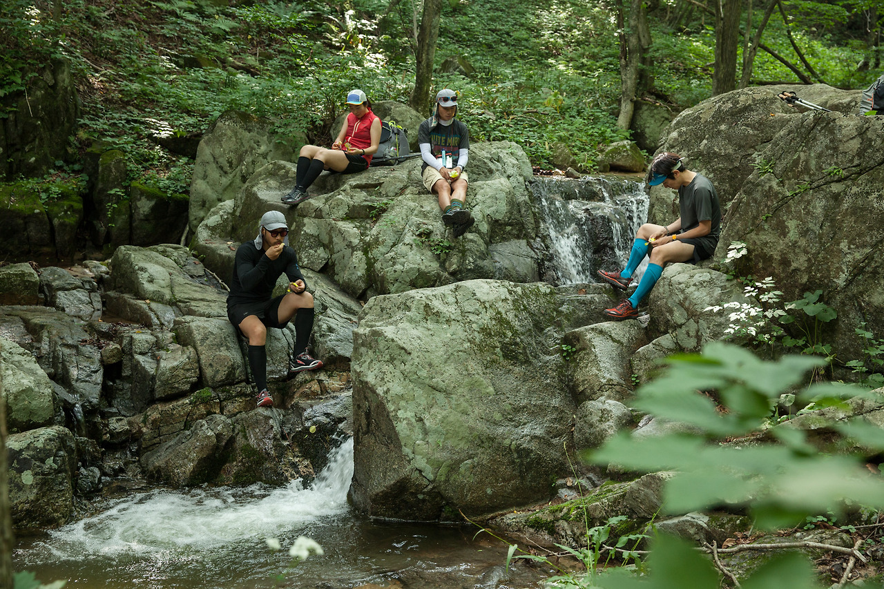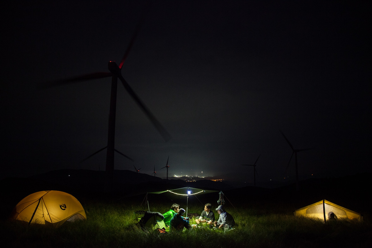 우리는 강원도 평창군의 신재생에너지 전시관 인근에 주차를 하고 선자령을 오르기 시작했다. 선자령은 올해 미국 노스페이스에서 주최한 ‘TNF 100’ 대회가 열렸을 만큼 검증된 트레일 러닝 코스. 포토그래퍼까지 다섯 명은 쌀과 고기 대신 초콜릿, 비스킷, 누룽지, 통조림 참치, 에너지 바 등을 지참했다. 요리가 필요한 음식은 따뜻한 물을 부어서 조리하는 동결건조 즉석 비빔밥뿐이었다. 물을 끓이는 용도로 스토브는 단 하나만을 준비했고 불필요한 연료의 무게를 줄이기 위해 LED 랜턴을 챙겼다. 햇볕과 비를 피할 타프도 하나뿐이었다. 장비를 공유하면서 그룹을 지어 달리는 방식에 대해 고민철은 ‘철새’ 같다고 했다. 주자들은 길을 찾고 서로의 상태를 파악하고 필요한 장비와 식량을 나누며 철새들과 같은 동반 상승효과를 경험한다.