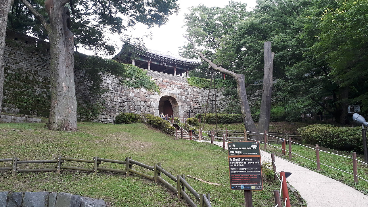 가파른 숲길을 오르고 산성터널 부근부터는 도로 옹벽 하단의 등산로를 따라 걷게 된다. 그 길 따라 걸으면 남한산성 석축이 바로 나타난다. 석축 아래쪽에 큰 돌은 옛사람이 쌓은 듯 자연석은 거칠고, 위쪽 새로 쌓은 화강석 면은 잘 다듬어져 있다. 성곽 위에 성가퀴라는 지붕이 있고, 화포 구멍도 비스듬하게 보인다. 성곽 따라 십분 남짓 걸으니 그 앞으로 사람들을 마중 나와 도열한 듯 나무들이 열을 맞추며 서 있다. 이름표를 보니 이팝나무였다. 도열한 나무 뒤로 산성의 웅장한 지화문이 모습을 드러냈다.