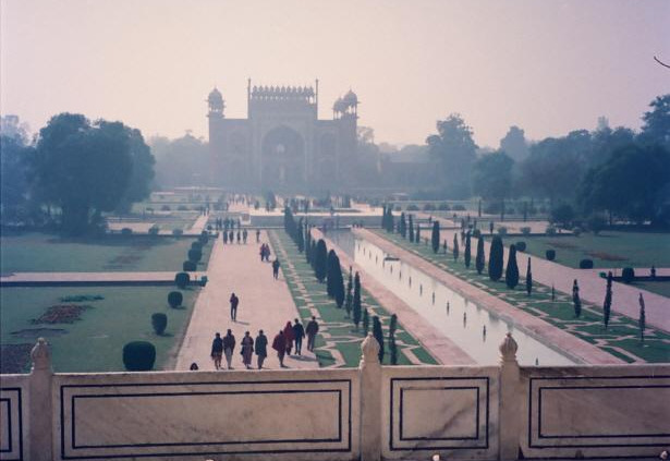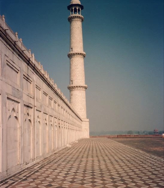 타지마할을 둘러싸고 있는 붉은 성곽의 문틈 사이로 언 듯 타지마할의 위용을 보았는데, 그 찰나 아찔한 느낌이었다. 타지마할의 웅장함은 기대 이상이었다. 한 뼘의 문틈으로 보이는 하얗게 빛나는 거대한 대리석 건물. 정면에 있는 분수 길을 따라서 그 타지마할로 서서히 다가가는 동안에, 햇볕에 반사되어 눈이 부신 타지마할의 규모는 고개를 좌우로 돌려도 그 건물이 시야에서 벗어나질 못했다.