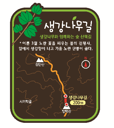 산초나무 숲길을 지나면 다음으로 마중 나온 것이 생강나무 숲길이다. 망덕산 오르는 비탈길에 산기슭부터 생강나무가 자라났다. 봄에는 철쭉나무와 같이 꽃을 피워 숲길을 빨갛고 노랗게 만든다. 생강나무는 가끔 산수유나무와 혼돈하는 경우가 있는데, 꽃이 피는 시기가 이른 봄이고, 모두 노랗게 꽃이 피기 때문이다. 하지만, 산에서 봄철에 만나는 노란 꽃의 나무들은 거의 생강나무다. 산수유나무는 대부분 조경수나 가로수로 도심에서 볼 수 있다.