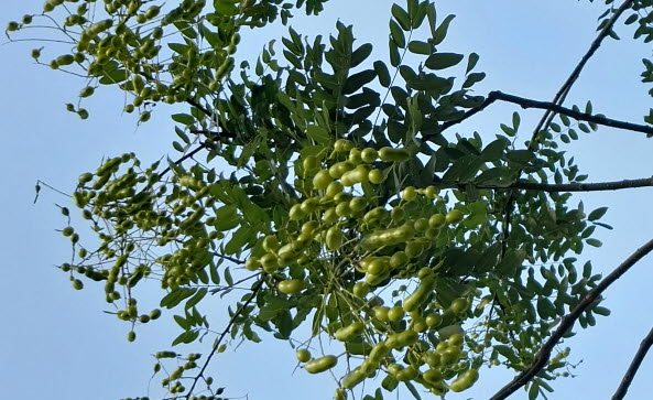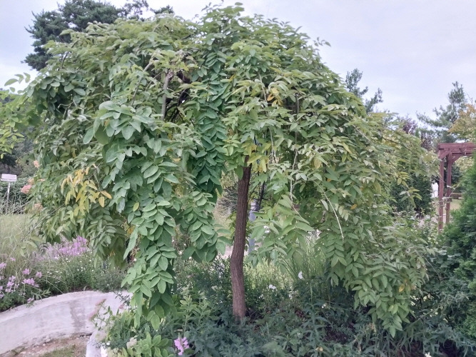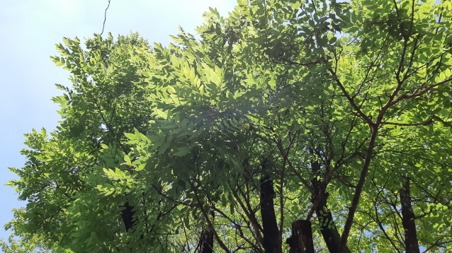 열매는 확연히 다르다. 아까시나무가 갈색 꼬투리가 열린다면 회화나무도 콩과식물로 초록 강낭콩을 여러 개를 실로 죽이어놓은 그것 같은 독특한 모양이다. 꽃과 열매에 모두 약효가 있어서 한약재로 쓰였다. 꽃에는 고혈압이나 콜레크테롤에 효과가 좋고 열매는 혈액의 응고를 촉진해주는 성분이 있어 출혈시 지혈재로 사용되기도 했다. 특히 동의보감에는 회화나무 열매를 먹으면 머리카락이 희지 않고 늙지 않는다고 했다. 그러고 보니 호야노인정이 회화나무 곁에 자리 잡은 것도 무병장수하며 오래오래 사시라는 뜻일 게다.