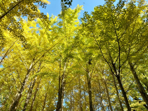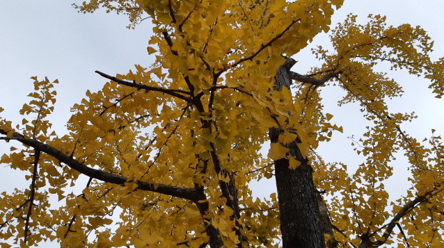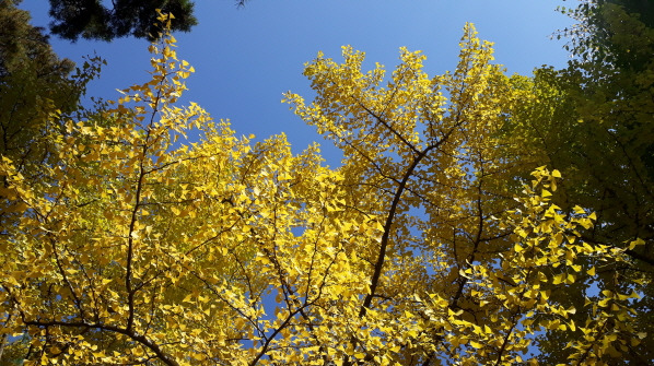 노란 단풍잎이라면 샛노란 은행잎을 빼놓을 수 없다. 예전에 책갈피로 종종 사용했다. 은행잎은 천연방부제 역할을 하여 책이 좀먹지 않도록 보호하여 준다. 물론 그런 뜻을 알고 있어서 책갈피로 쓸 리 없다. 단지 노란 색깔이 예뻐서 빨간 색깔의 단풍잎과 같이 책갈피로 썼다. 은행나무를 영어로 번역하면 금발나무(Maidenhair tree)다. 은행나무 금빛 넘실대는 잎사귀 모습이 서양 여자의 금발 머리칼과 비슷하다는 비유가 단박 이해되었다.