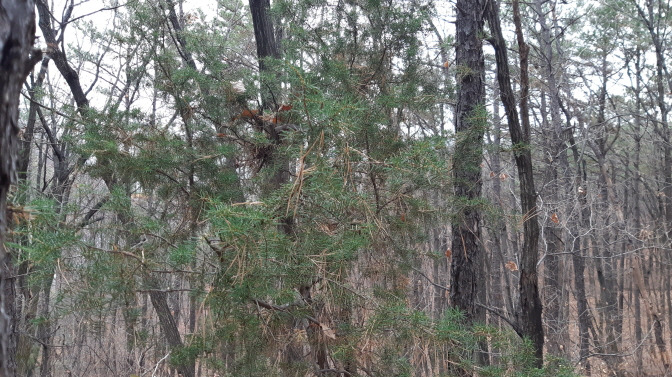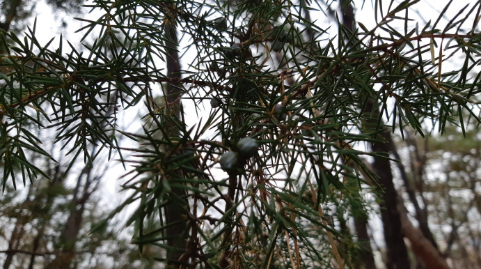 응달평산을 거쳐 맹정승 묘소로 가는 숲길은 다른 산보다 침엽수 중에서 노간주나무가 우점종이다. 드문드문 보이는 것이 아닌 노간주나무가 군락을 이루며 자라났다. 물론 다른 나무들이 아름드리로 하늘 높이 자랐는데 반해 노간주나무는 굵기는 손으로 움켜쥘 정도가 대부분이다. 다른 나무 틈바구니에서 아등바등 살아가야 했는지 나뭇가지도 옆으로 퍼지지 못하고 하늘 위로만 쭉쭉 자라났다. 노간주나무는 제법 키가 큰 나무임에도 불구하고 땅을 가장 적게 차지한다. 나뭇잎도 가시같이 뾰족하여 자칫 스치면 따끔하다. 가뜩이나 메마르고 가파른 땅 떼기에 그것도 느리게 자라는데 이마저 동물이 우적우적 씹어먹기라도 하면 큰일이니까.
