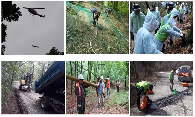 중장비가 들어가는 길은 굴삭기와 덤프트럭을 동원해 길을 정비했고, 깊은 숲은 헬기를 이용해 부지런히 자재를 운반했다. 그것도 힘들면 직접 작업자들이 운반하고, 시민들도 흙 나르는 것을 도우며 유실된 토사를 북돋기도 했다.