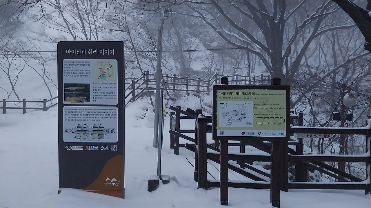 눈이 제법 많이 내려 정자에서 쉬기로 한다. 정상 해설판 앞면에는 마이산 이야기가 있다. 마이산이 금광과 섬진강의 발원지라는 것이다. 그런데 아무리 마이산이 명승지라고 하지만, 호남의 두 거대한 강물줄기인 금강과 섬진강의 발원지라고 하니 선뜻 믿기 어렵다. 뒤편에는 마이산과 쉬리 이야기가 있다. 읽어보니 마이산을 중심으로 수계가 나뉜다는 것인데, 이 이야기가 더 신빙성이 있다.