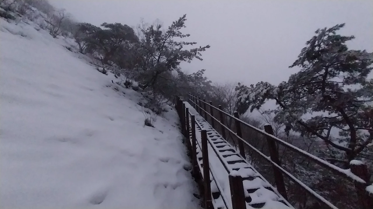 정자에 하릴없이 앉아 있다. 그러면서 일출이 아니라면 그저 산길에서 눈이 많이 내리니 잠시 강설을 피해 갈 요량으로 정자에 앉아 있는 거라 생각하기로 했다. 그런데, 등산하면서 진눈깨비 같은 습설을 다 맞고 올라와서 옷도 다 젖었다. 정자에 가만히 앉아 있으려니 몸이 으스스스 춥고 떨린다. 일출을 볼 수 없다면 눈에 젖은 몸으로는 한시라도 빨리 하산하는 것이 당연하다.