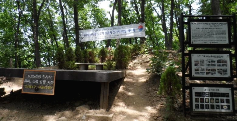 비단 UN군뿐만 아니라 한국군의 젊은이도 이 산에 많은 피를 뿌렸는데, 대지산에서 가파르게 내려가는 길 둔덕 위로 평상과 소총 위에 철모가 걸려있는 조형물이 있다. 그곳은 6.25 전쟁 전사자 유해와 유품 발굴지점이라는 팻말과 함께 유해 4구와 유품 45점이 수습되었다고 한다. 유해 발굴 절차를 보여주는 해설판과 호국용사 유품이라는 소총과 총알 등을 사진으로 전시했으며, 유품 중에는 머리빗도 있고 시계도 있었다. 빗발치는 총격전이 끝나면 땀에 젖은 머리칼을 다듬을 줄 알았고, 폭탄이 머리 위로 떨어지는 촌각을 다투는 전투에서도 회중시계를 꺼내보는 젊은이일 것이다. 애꿎게도 전쟁터에서 죽어가는 건 젊은이다.