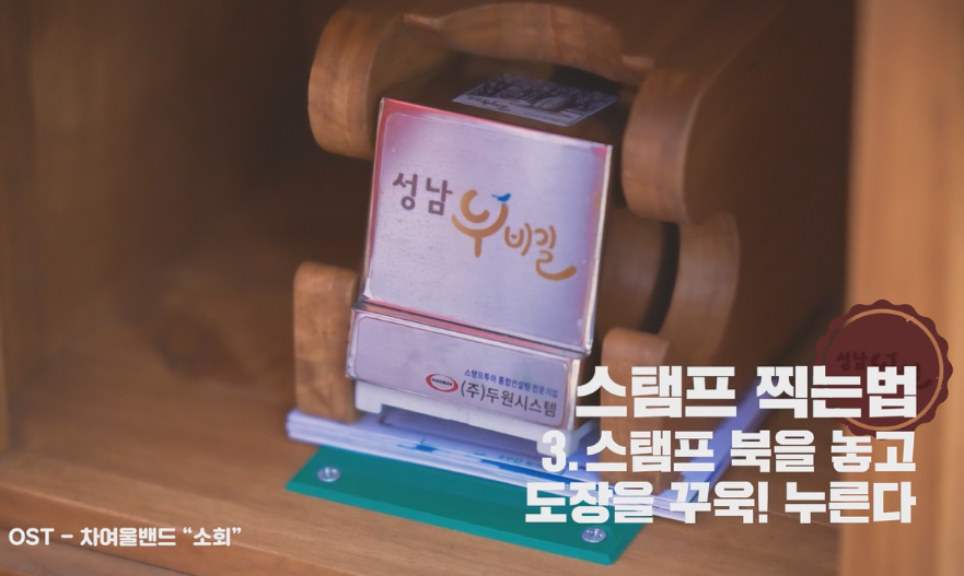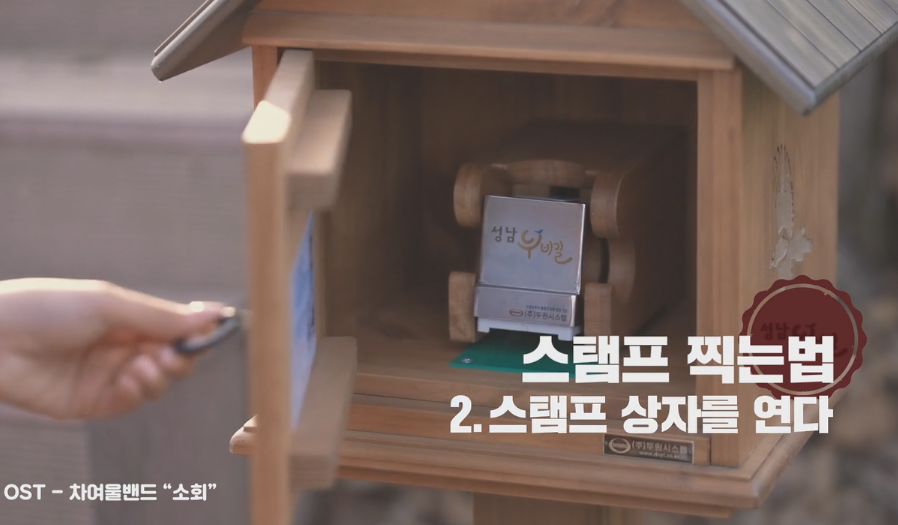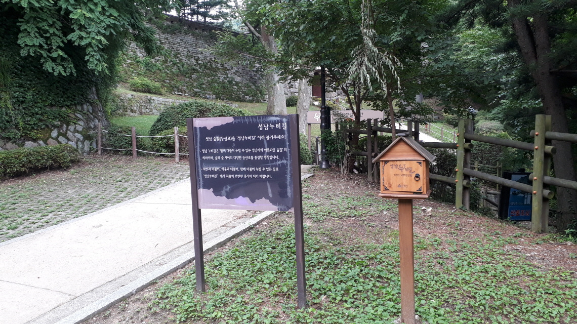남한산성길 종점 지화문 앞에는 성남 누비길을 알리는 현판과 함께 귀여운 새집 모양의 목재 조형물이 있다. 전원주택 마당에 있을 법한 우체통 같은 모습이다. 나무 상자 전통문양의 문고리를 당겨보면 안에 두툼한 쇠뭉치가 있다. 이것이 바로 남한산성길을 완주했다고 도장을 찍을 수 있는 스탬프다.