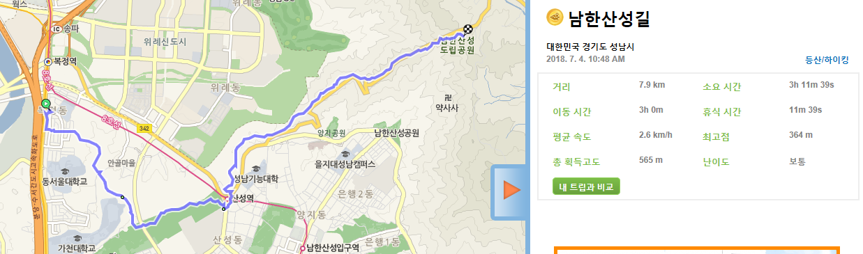누비길 등산 안내 팸플릿에는 1구간 거리는 7.5km이고 소요시간은 4시간이나, 실제로 램블러라는 등산 앱을 활용하여 산행한 정보를 확인하면 거리는 7.9km이다. 아마도 등산로에서 벗어나 곳곳을 구경하느라 다닌 거리가 포함된 것이다.