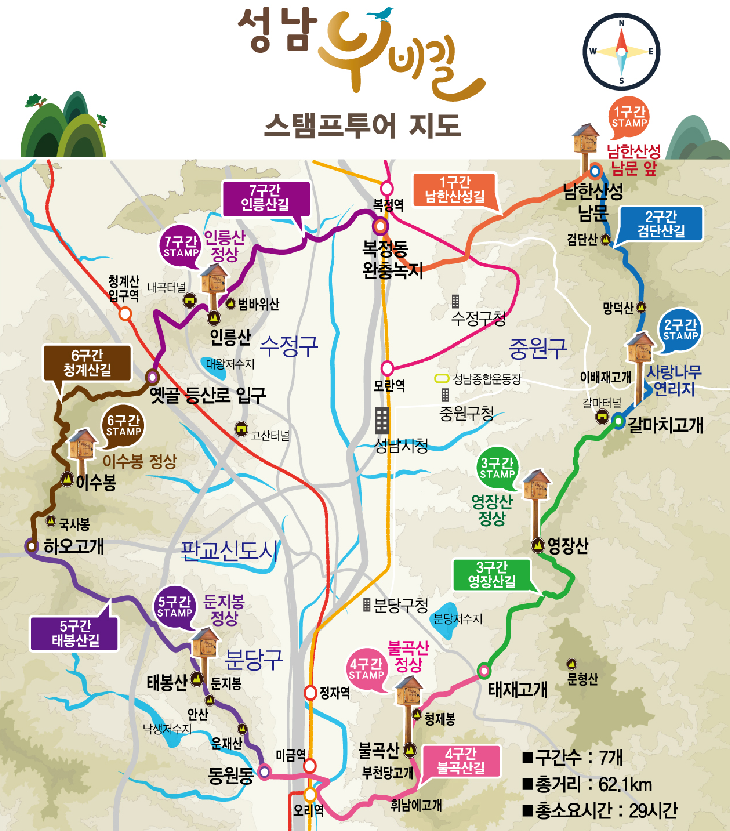 누비길은 성남 시 경계를 이루는 남한산, 검단산, 영장산, 불곡산, 태봉산, 청계산, 인릉산 등 명산을 기준으로 7개 구간으로 나누었으며, 그중 첫 번째 구간인 남한산성길은 복정동 완충녹지에서 출발하여 태평동 영장산 정상과 이번 추석쯤 준공 예정인 산성 육교와 시원한 물줄기가 쏟아지는 산성 폭포를 건너고, 불망비를 보며 걷다가 남한산성 남문까지 오는 길이다.