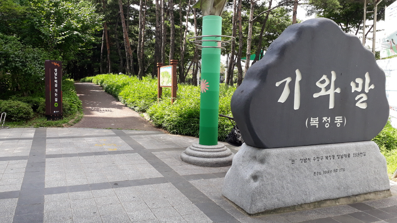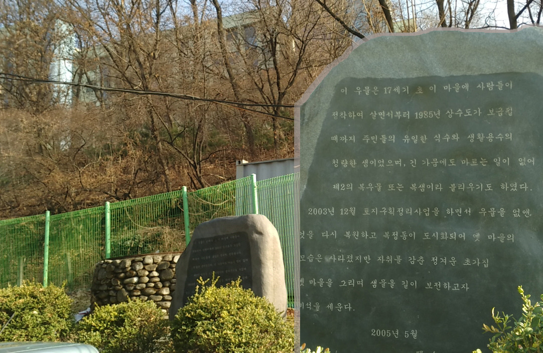 뒤돌아 비석 뒤를 보니 먼 옛날에 기와를 굽던 큰 가마가 있었다 하여 기와말이라 불렸다고 한다. 그리고 복정동 (福井洞)이라는 지명은 한자 그대로 복우물(福井)과 관련 있다.