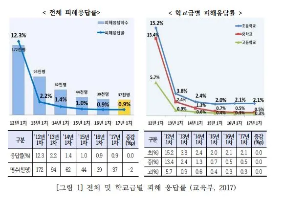 위 조사 결과를 통하여 우려되는 점은 피해학생의 나이가 해마다 어려지는 ‘저연령화’ 추세이다. 또래 및 선생님과의 관계를 통해 다양한 경험과 성장을 해야 할 시기에 겪는 심리적·신체적 통증의 발현은 언제, 어떤 방향으로 나타날지 예측과 가늠이 되지 않는다. 건강한 아동·청소년기를 거쳐 성인이 되는 과정에서 좋은 경험과 지지를 받아야 할 아이들이 폭력이라는 극한의 고통을 감내해야 하는 것이 학교의 현실이다. 이로 인해 삶을 포기하는 아이들이 늘어나고 있지만 이를 지켜보는 어른들의 시선과 행동은 무기력하다.