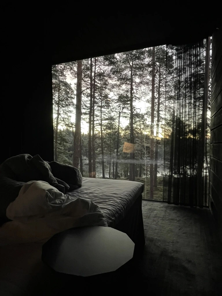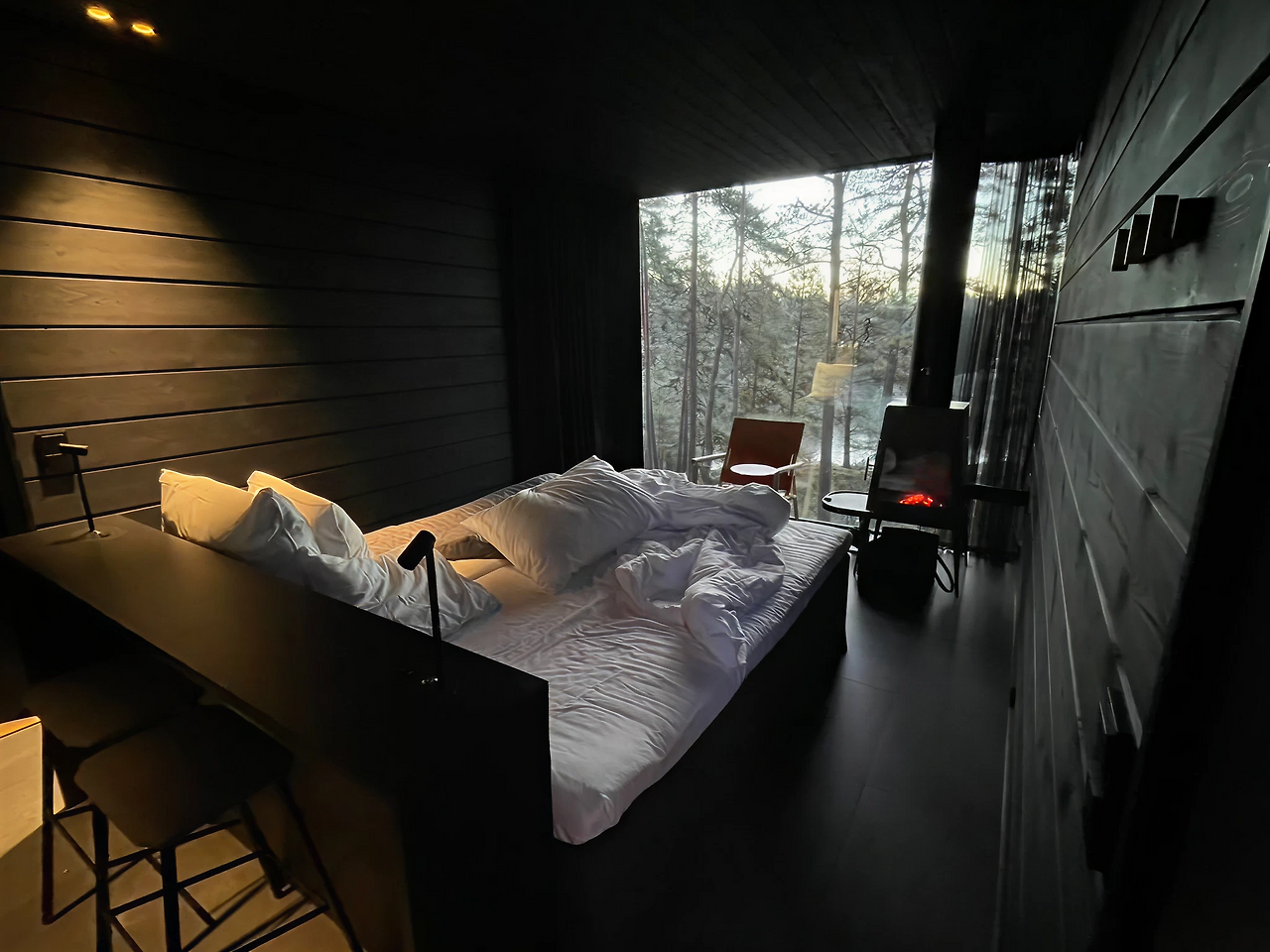 1. 캐빈 한 채는 매우 심플하게 화장실과 샤워실, 침실과 침대 바로 뒤에 붙어있는 바 테이블, 그리고 침대 앞으로 전면 통창이 있어 숲과 바다가 탁 트이게 보이게 되어있다. 모든 객실에 적용되는 기본 셋업이다.