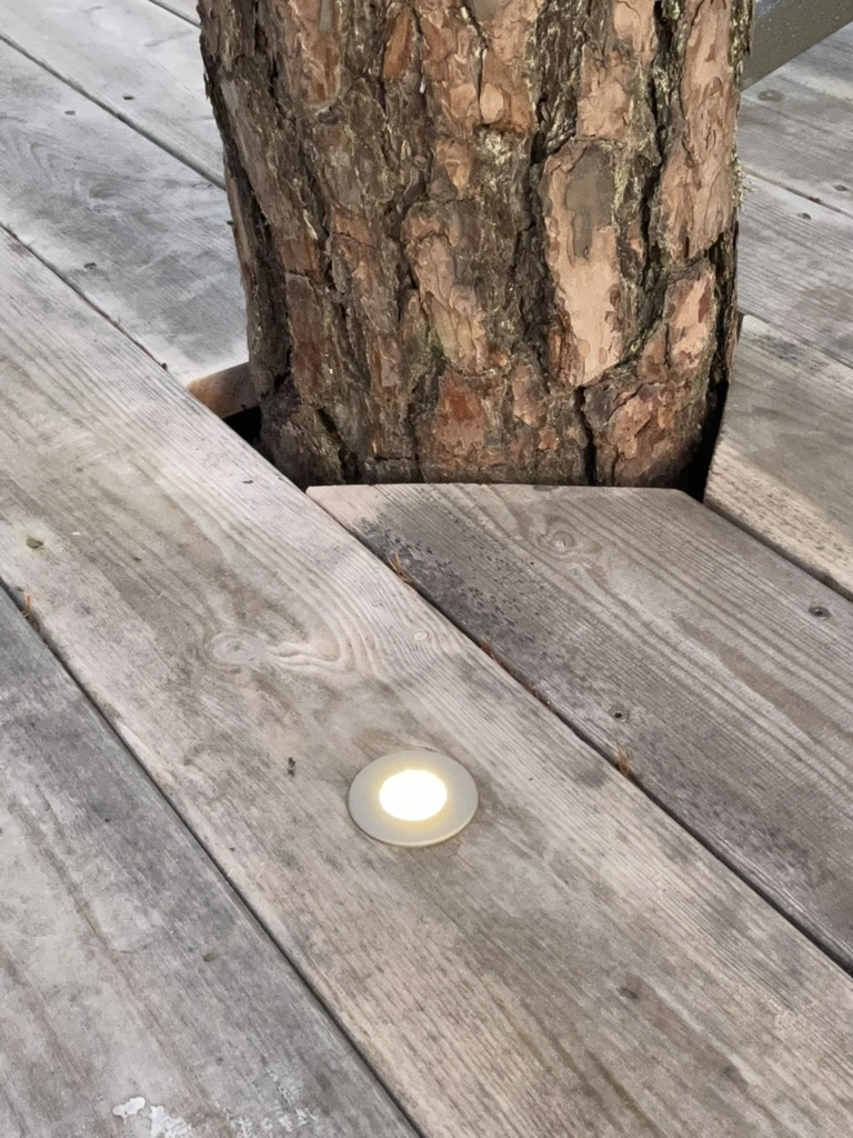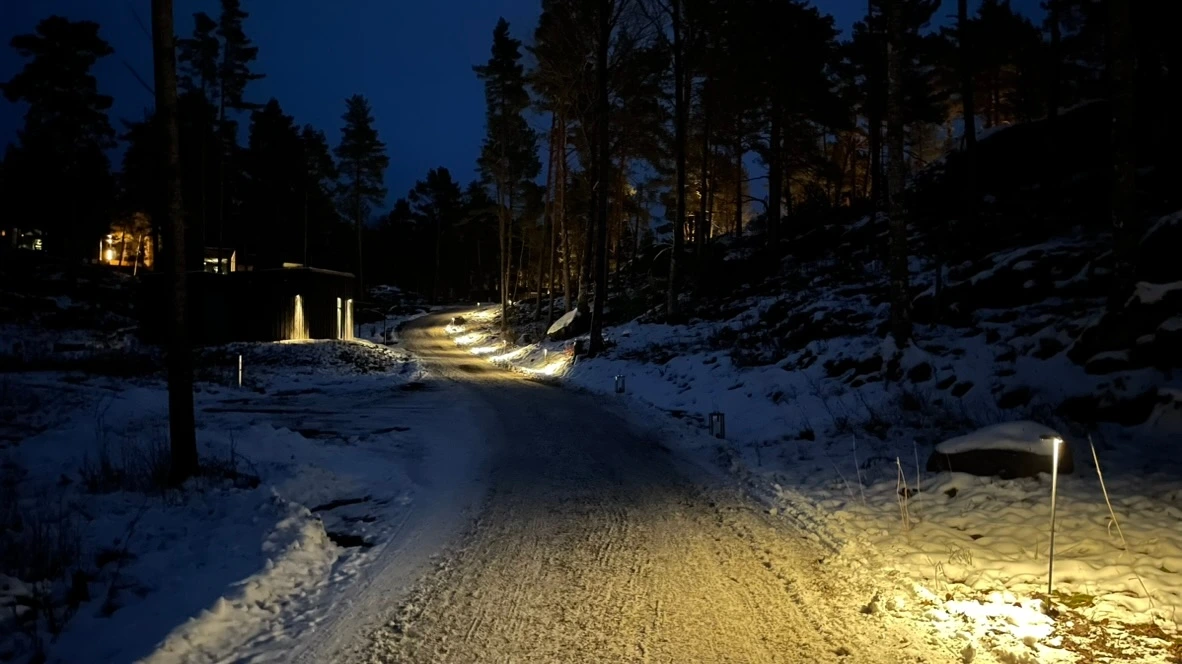 핀란드 특유의 소나무와 바위에 얹어진 이끼들이 보이는 숲길을 따라 올라가면 길을 밝게 비춰주는 가로등이나 볼라드 등은 찾아볼 수 없고, 얇게 검은 막대만 듬성듬성 꽂혀있고, 길의 경로가 보일 정도로만 아주 옅게 비추는 조명들만 있다.
