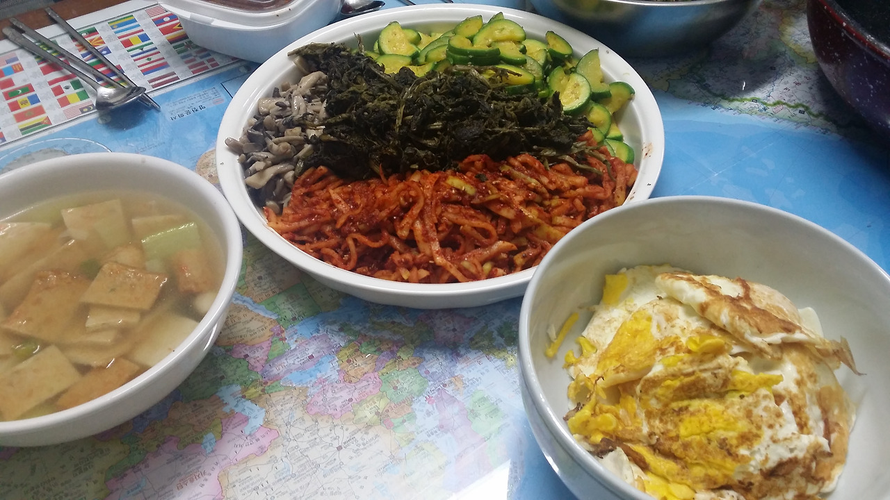 비빔밥 5종나물과 계란프라이가 차려지고