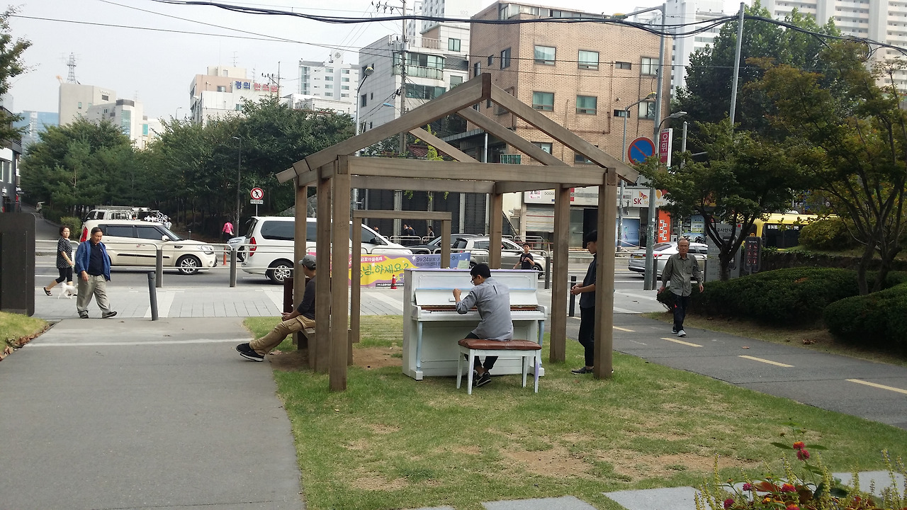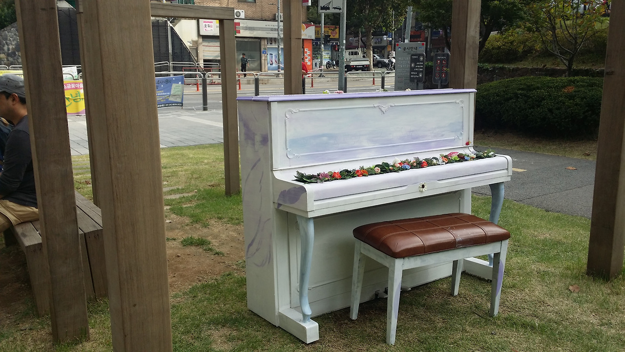 어린 청년이 피아노에 앉아 연주를 하고 있다.