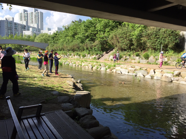 성내천 어디쯤에서 스마트폰을 들고 사람들이 달려온다.