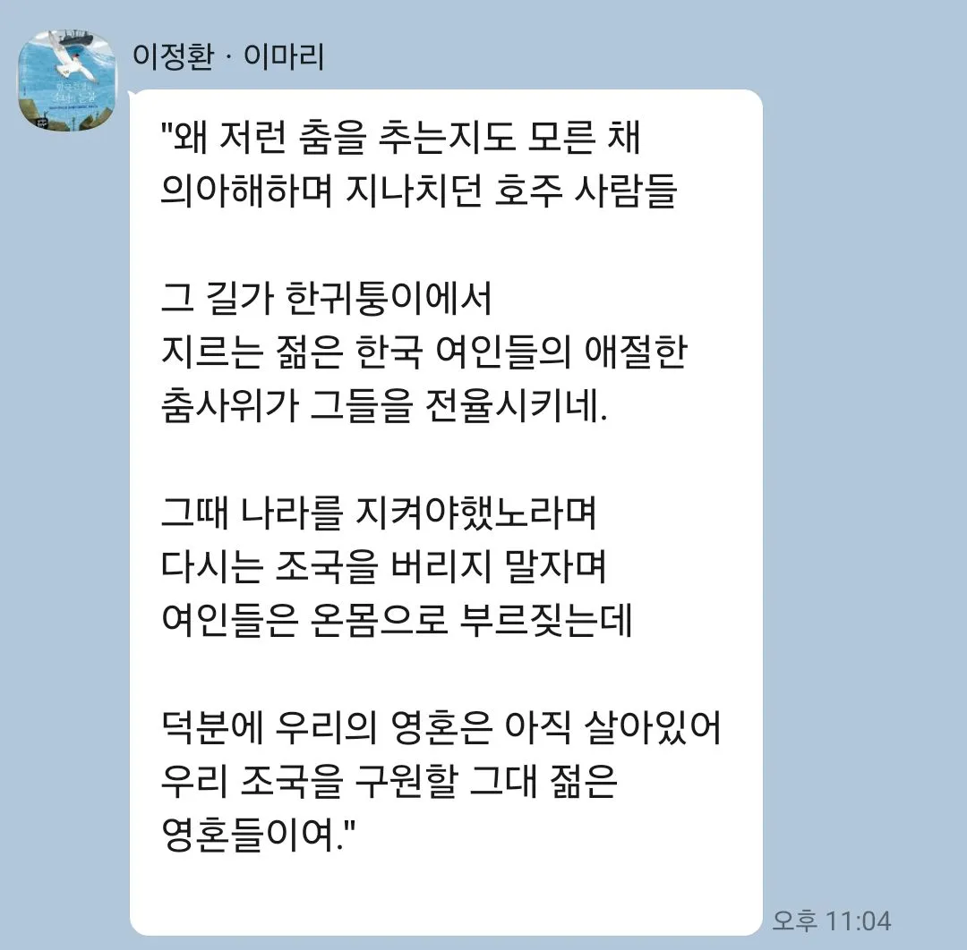 시드니 한복판 길가에서 생판 모르는 춤을 추는 한국여성 무용수들의 춤사위에 왜 그리 가슴이 뜨거워지는지... 그 자리에서 그때의 독립의 열망을, 다시는 나라를 빼앗기지 않겠다는 의지를 남반구 어느 거리에서 몸짓으로 외치는 그들의 용감함에. 눈시울이 붉어졌다.