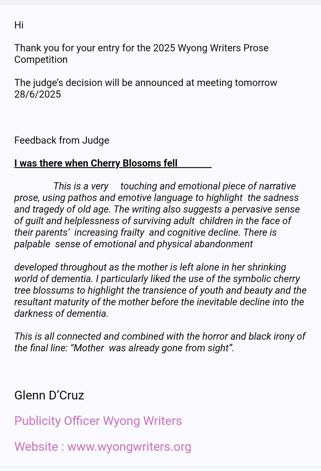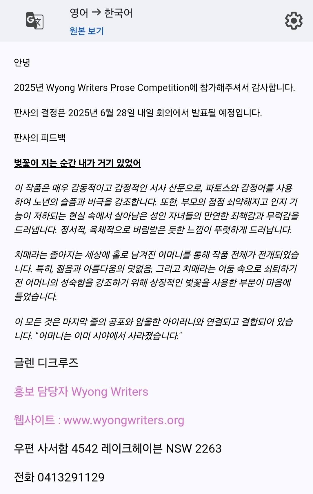 호주와용작가클럽에서 올해의 작가상을 수상했다. 단편소설(1500자)공모전이 있어서 준비해 응모한 덕이었다. 호주에 거주하는 동안 영어권의 작가들의 글쓰기를 탐색하고 싶어 작가 모임에 등록을 했었다. 일년이 채 되지않은 시점에 백인 작가들 젖히고 나에게 돌아온 상이 믿어지지 않았다. 기쁘고 감격스러웠다. 호주의 지역상이긴 하지만 영어글쓰기에 자신감을 준 상이라고나 할까. 더 열공해야겠다. 아래 심사위원의 평을 영어와 한글로 수록한다.