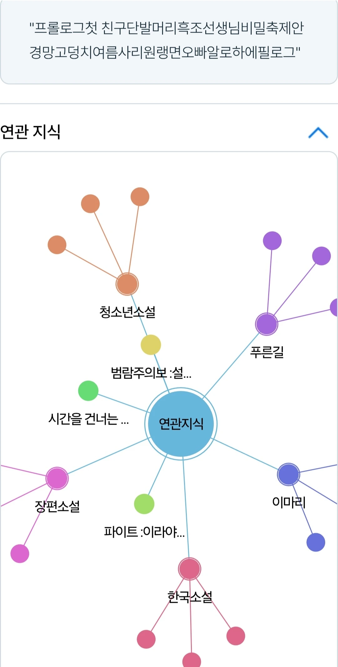 작년 6월에 출간된 청소년장편소설을 오랜만에 인터넷 서치했다. 디지털국회도서관/디지털집현전에 뜬 연관지식 난의 도표를 보고 깜짝 놀랐다.