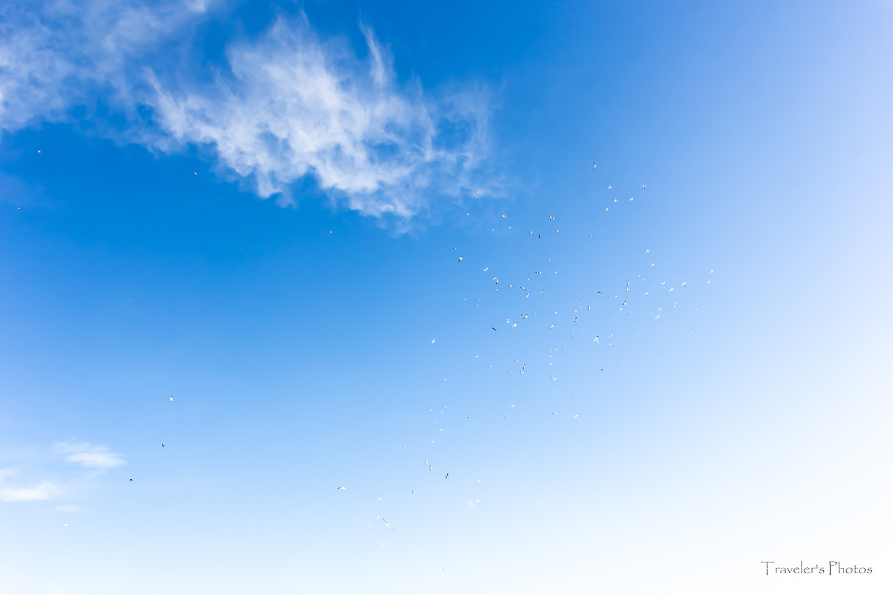 수초의 푸른빛과 어우러진 쪽빛 하늘고 바다, 그 사이를 거침없이 날아드는 새들의 군무가 잘 어우러져 한 폭의 그림을 보는 듯하다.