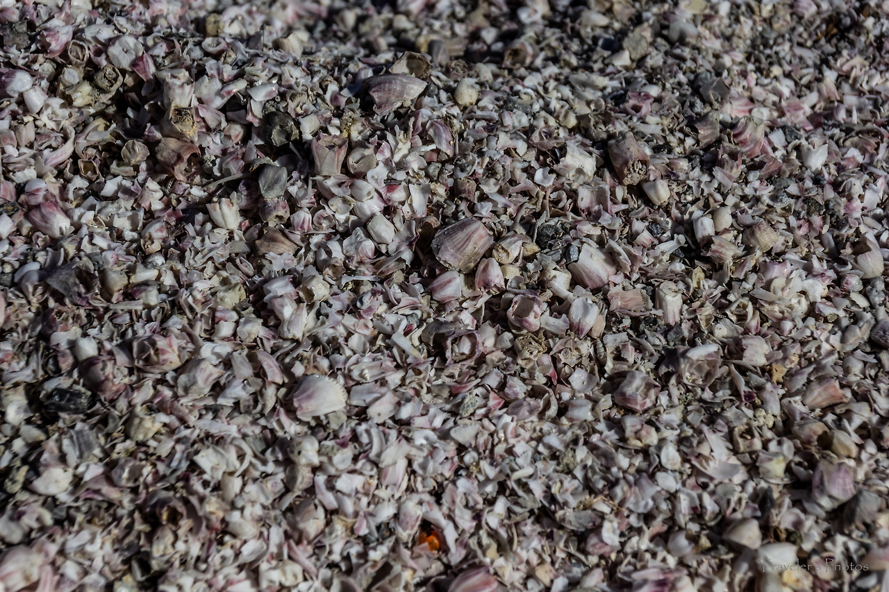 바다 모래가 보통 희거나 노르스름한데 여기 모래는 분홍빛을 띄는 것 같기도 하고 어찌 보면 보랏빛 같기도 하면서 또 어떤 곳은 희기도 하다. 처음엔 '그럴 수도 있지' 하면서 걷다가 아무래도 모래 결도 다르게 느껴지고, 밟히는 느낌도 바닷가 모래밭과는 많이 달라 쪼그리고 앉아 모래를 가만히 들여다봤다. 그런데 놀랍게도 모래처럼 펼쳐져있는 것은 모래가 아니라 사진에서 보듯이 조개껍질이 잘게 부서져 쌓인 것이다.