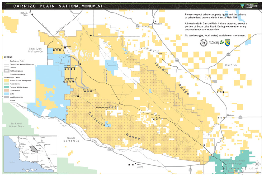 카리조 대평원의 꽃 이야기를 하기에 앞서 이곳이 어떤 곳인지 짤막하게 이야기하고 넘어가는 것이 좋겠다. 카리조 대평원은 로스앤젤레스 북서쪽 150마일, 약 세 시간 거리에 있다. 준국립공원(National Monument)으로 지정되어 있지만, 국립공원 관리청(NPS)에서 관리하는 다른 곳과는 달리 이곳은 국토관리부(BLM)에서 관리하는 지역이다. 두 기관은 모두 국토를 관리하는 정부기관이기는 하지만, 관리 기준이 다르기 때문에 중복되는 지역은 없다. 국립공원 관리청은 엄격한 기준으로 땅을 관리한다. 이를테면 공원 구역 안에서 허가된 곳 말고는 야영을 허용하지 않고, 낚시. 사냥. 채집 따위의 일체의 행위를 금지한다. 반면 국토관리청은 조금 느슨하게 관리하는데, 넓은 구역을 정해놓고 야영, 낚시나 사냥 등을 허용하는 식이다. 그러므로 카리조 대평원의 국립기념물 구역 안에서는 개발된 야영장 말고도 주변의 야산에서 일정한 조건 아래 야영을 할 수 있다. 사실 캘리포니아의 센트럴 밸리(프레즈노에서 베이커스 필드에 이르는 넓은 분지 지역을 말함)는 오래전부터 목초지였다. 엘크나 영양 등 동물들이 살아가기에 알맞은 이곳은 봄이면 야생화가 만발했다. 사람들이 비옥한 이 땅에 찾아들어 살기 시작하면서 초지를 농지로 바꿨고, 해를 거듭할수록 초지는 줄어만 갔다. 그러기를 몇 백 년 거듭하면서 대부분의 초지는 사라지고 그나마 외딴곳에 있는 카리조 플레인 지역, 캘리포니아 양귀비 보호구역 따위 몇 곳만 남게 되었고, 이곳을 보전하기 위해 국가기념물이나 보호구역으로 정해 지금에 이르렀다. 카리조 대평원은 산 안드레아스 단층이 지나면서 만들어진 지형으로 주변을 둘러싼 산봉우리들과 그 사이에 끝없이 펼쳐진 평원이다. 이 평원 안에 소다 호수(Soda Lake)가 있는데, 평소에는 말라있는 호수지만 겨울철 비가 내리면 물이 차오른다. 특이한 것은 이 호수는 들어온 물이 나갈 곳이 없어 건기에 물이 마르면 베이킹 소다처럼 보이는 소금기가 드러나 데스밸리의 배드 워터를 떠오르게 한다. 이런 척박한 땅에서 봄이면 끝도 없이 펼쳐지는 꽃잔치를 보는 일은 그저 신비로울 따름이다.