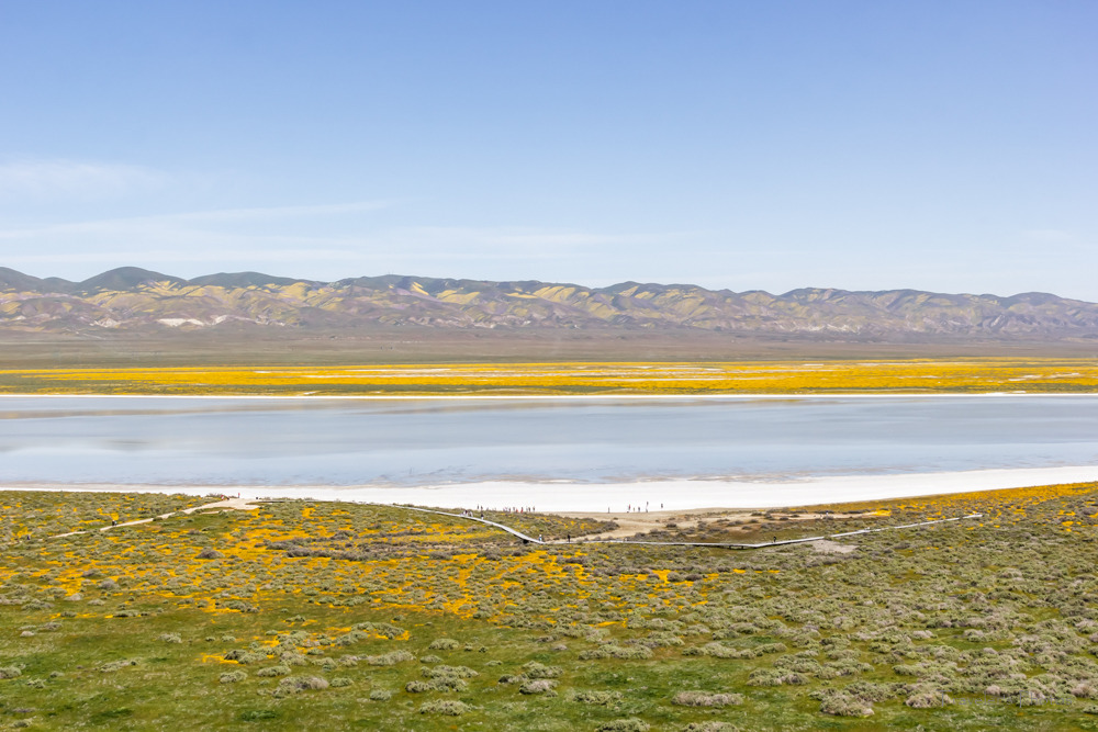 카리조 플레인 가운데 있는 소다 호수와 카리조 플레인을 거의 빙 둘러가며 볼 수 있는 전망대가 하나 있다. 물론 이곳이 아니라고 해도 호수를 둘러싼 템블러 산이나 깔리안테 산에 오르면 볼 수는 있지만, 산을 오르는 수고를 해야 한다. 그런데 방문자 안내소 못미처에 있는 이 전망대는 주차장에 차를 대로 십여 미터만 오르면 눈앞이 뻥 뚫리는 풍경을 볼 수 있다. 이 전망대를 내려오면 길 건너에 주차장이 하나 더 있는데, 이곳은 다름 아니라 소다 호수를 걸어서 둘러볼 수 있는 트레일을 위한 곳이다. 호수 가까이 들어가면 나무로 걸을 수 있는 길을 냈는데, 호수 주변의 생태 환경이나 하얀 호수 바닥을 가까이서 볼 수 있다. 이 나무다리를 걷지 않고 바로 호수로 내려가 볼 수도 있지만, 겉보기와는 달리 좀 질척하므로 신발이 더러워지는 것을 감수해야 한다.