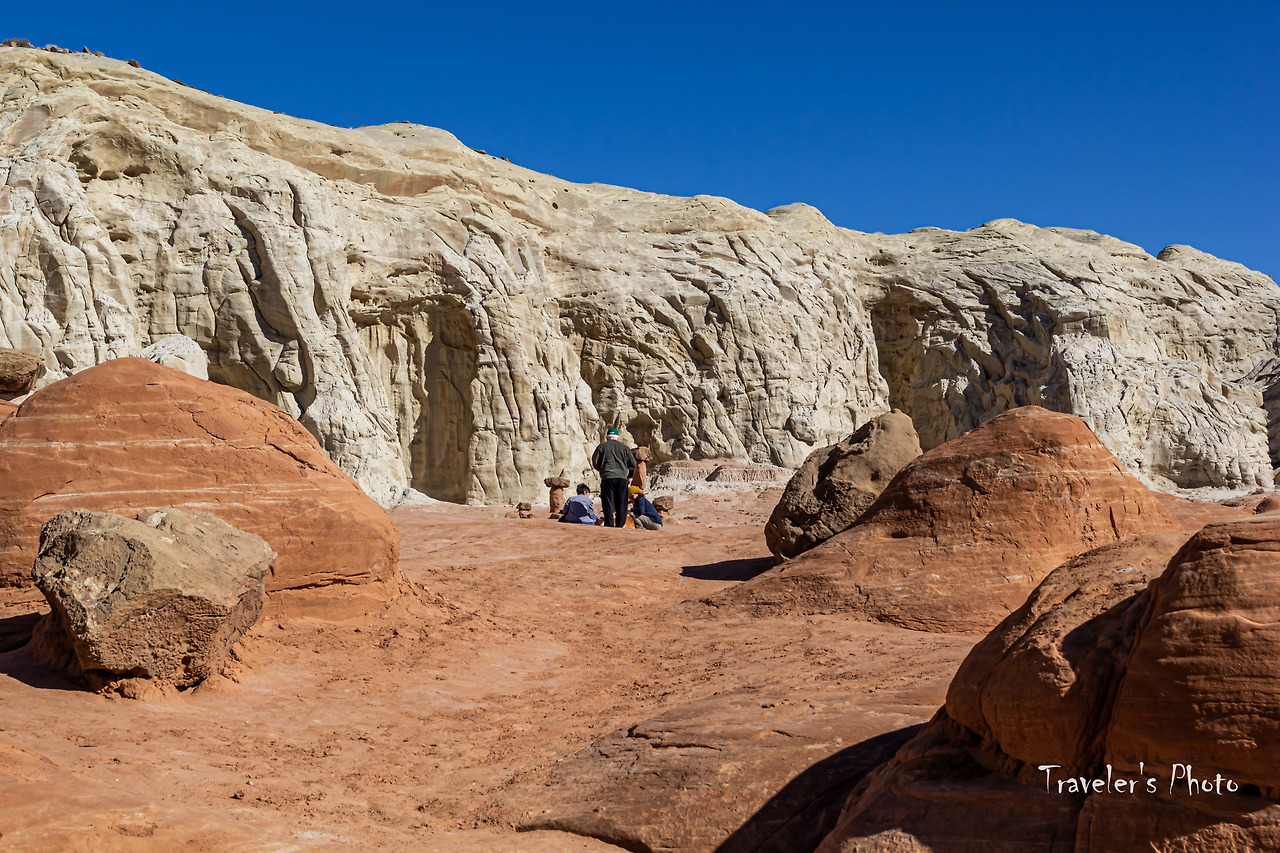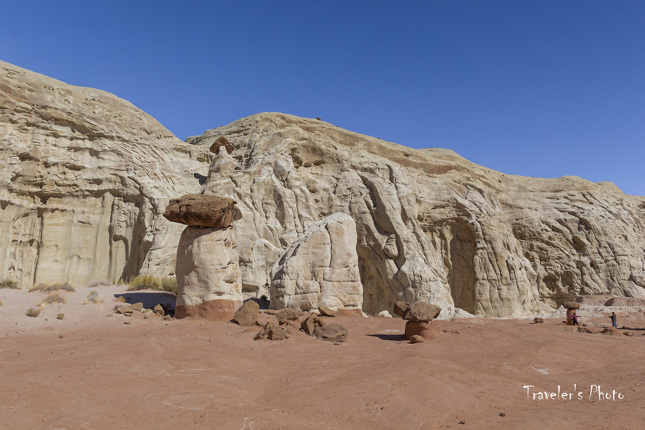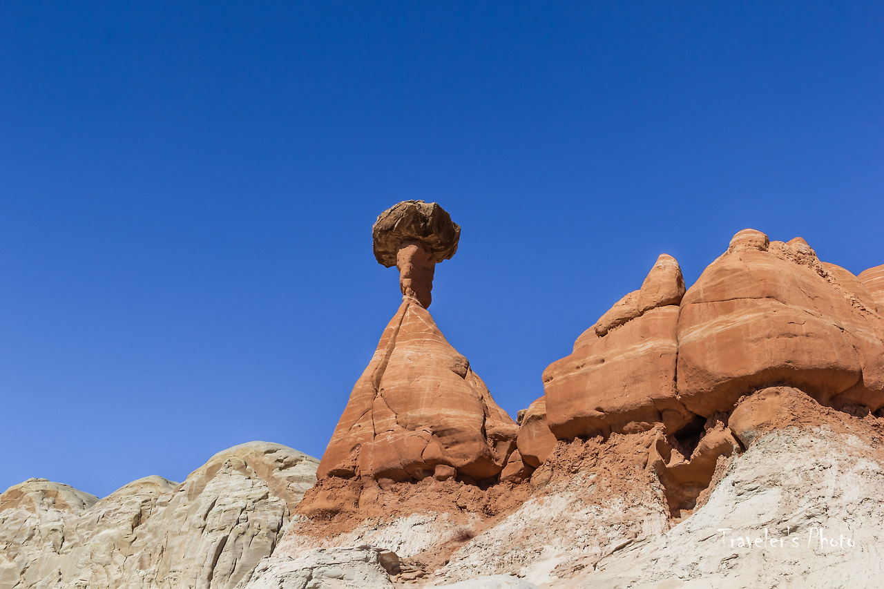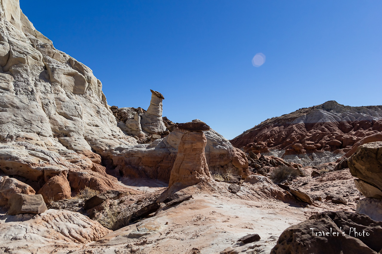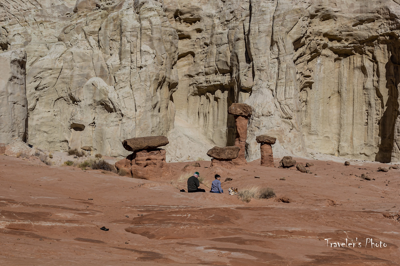 버섯모양 바위들이 보이기 시작했다. 유타의 다른 지역에서 만날 수 있는 모자를 쓴 황톳빛 후두들이 들쭉날쭉 여기저기 서있다. 다른 지역과는 달리 수가 그리 많지는 않았지만, 붉은 빛깔 후두와 주변을 병풍처럼 두르고 있는 커다란 바위의 흰 빛깔이 대비를 이뤄 첫눈에 강렬한 인상을 준다. 사실, 그동안 여러 지역에서 후두를 봐왔고 아직 가보지 않은 유타의 다른 지역들에도 후두가 많이 있다. 후두는 그만큼 흔한 대상이라는 말이지만, 그렇게 흔한 수많은 후두들도 똑같이 생긴 것은 하나도 없다. 따져보면 세상에 똑같은 것은 하나도 없지 않은가! 아무리 기계로 찍어내는 공산품도 미시의 세계로 들어가면 완연히 다른 구조를 가지고 있다. 구조만 그런가! 같은 물건을 대하면서도 기분과 환경에 따라 전혀 다른 것으로 보이는 경우는 허다하다. 하물며 생명이 있는 것들은 말해 무얼 하랴. 따라서 너무 흔하기 때문에 아무리 새로운 경치를 봐도 별 감동 없이 그저 심드렁하게 사진 한 장 찍고 물러선다면 정말 중요한 것을 놓치고 있는 것인지도 모르겠다.