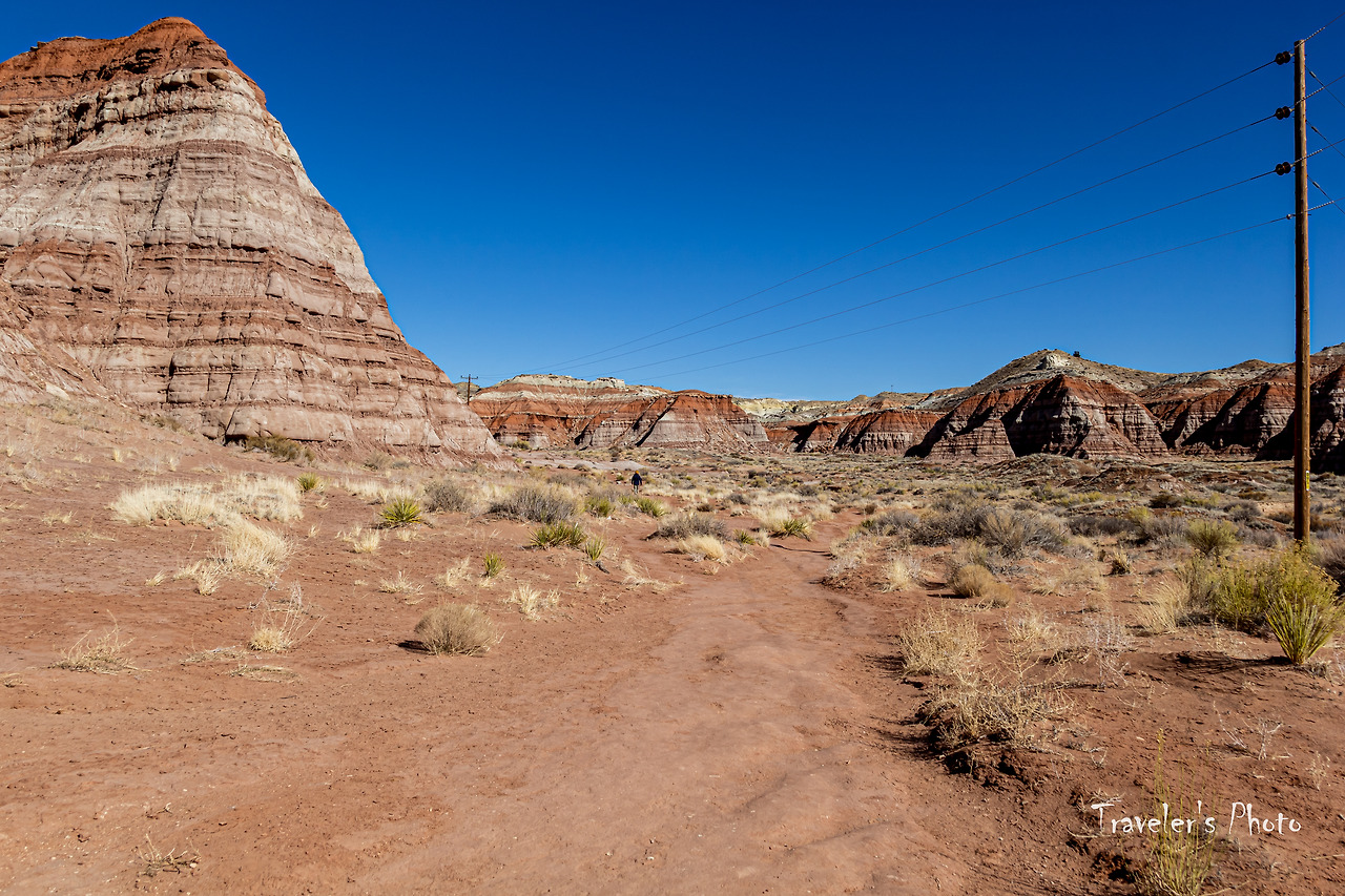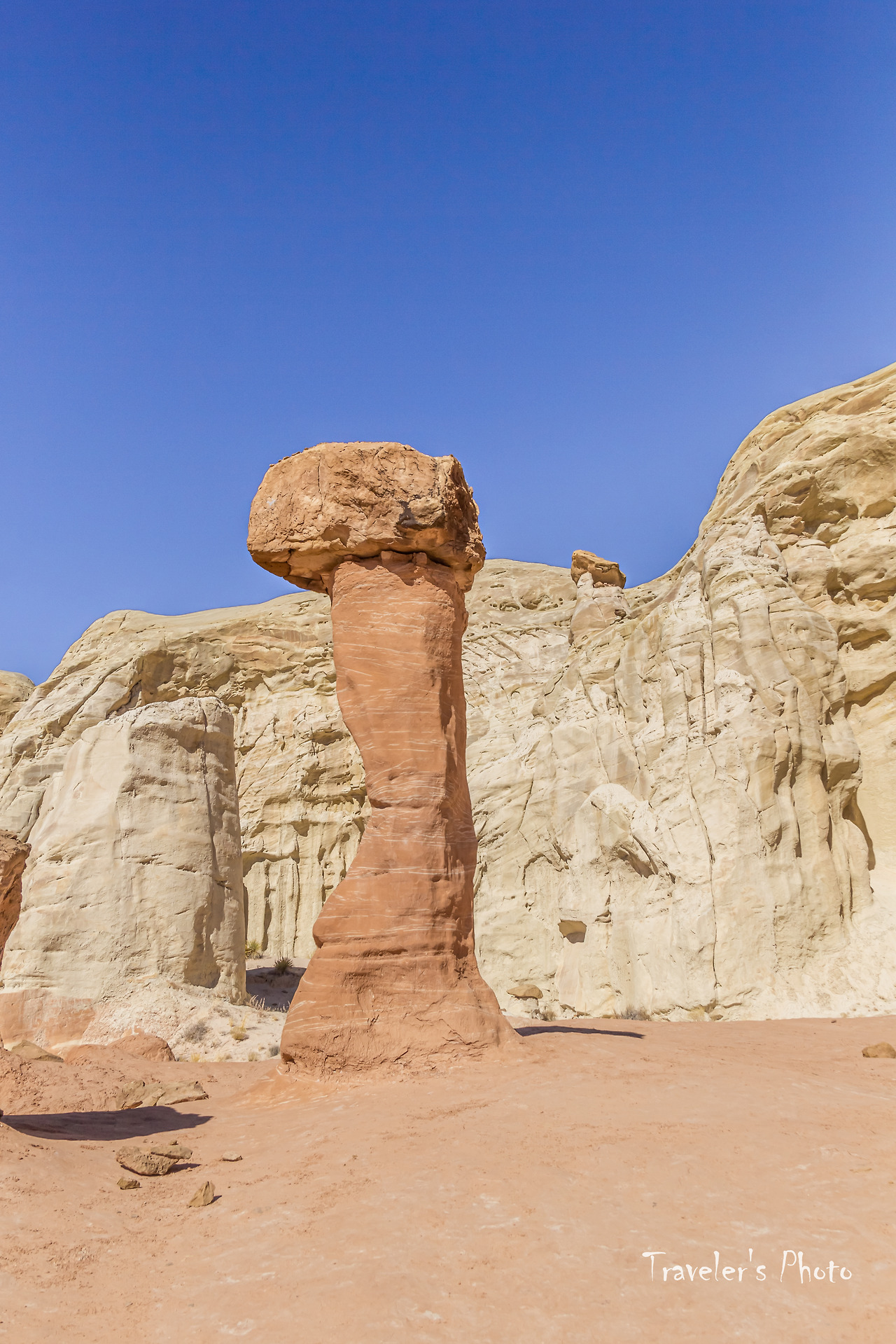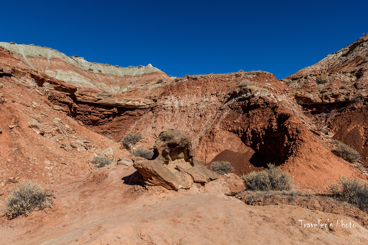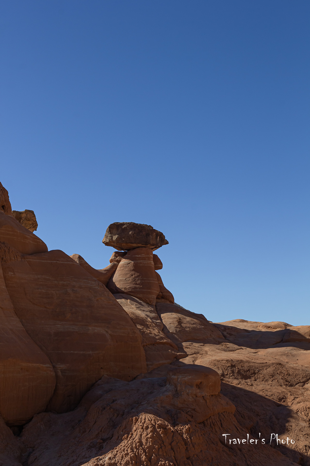 버섯모양 바위들이 보이기 시작했다. 유타의 다른 지역에서 만날 수 있는 모자를 쓴 황톳빛 후두들이 들쭉날쭉 여기저기 서있다. 다른 지역과는 달리 수가 그리 많지는 않았지만, 붉은 빛깔 후두와 주변을 병풍처럼 두르고 있는 커다란 바위의 흰 빛깔이 대비를 이뤄 첫눈에 강렬한 인상을 준다. 사실, 그동안 여러 지역에서 후두를 봐왔고 아직 가보지 않은 유타의 다른 지역들에도 후두가 많이 있다. 후두는 그만큼 흔한 대상이라는 말이지만, 그렇게 흔한 수많은 후두들도 똑같이 생긴 것은 하나도 없다. 따져보면 세상에 똑같은 것은 하나도 없지 않은가! 아무리 기계로 찍어내는 공산품도 미시의 세계로 들어가면 완연히 다른 구조를 가지고 있다. 구조만 그런가! 같은 물건을 대하면서도 기분과 환경에 따라 전혀 다른 것으로 보이는 경우는 허다하다. 하물며 생명이 있는 것들은 말해 무얼 하랴. 따라서 너무 흔하기 때문에 아무리 새로운 경치를 봐도 별 감동 없이 그저 심드렁하게 사진 한 장 찍고 물러선다면 정말 중요한 것을 놓치고 있는 것인지도 모르겠다.