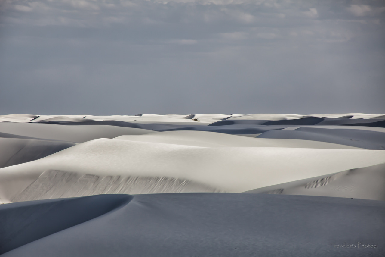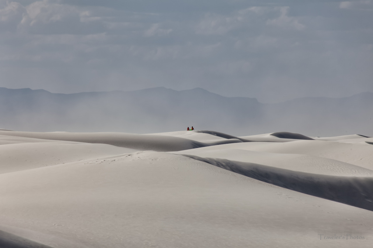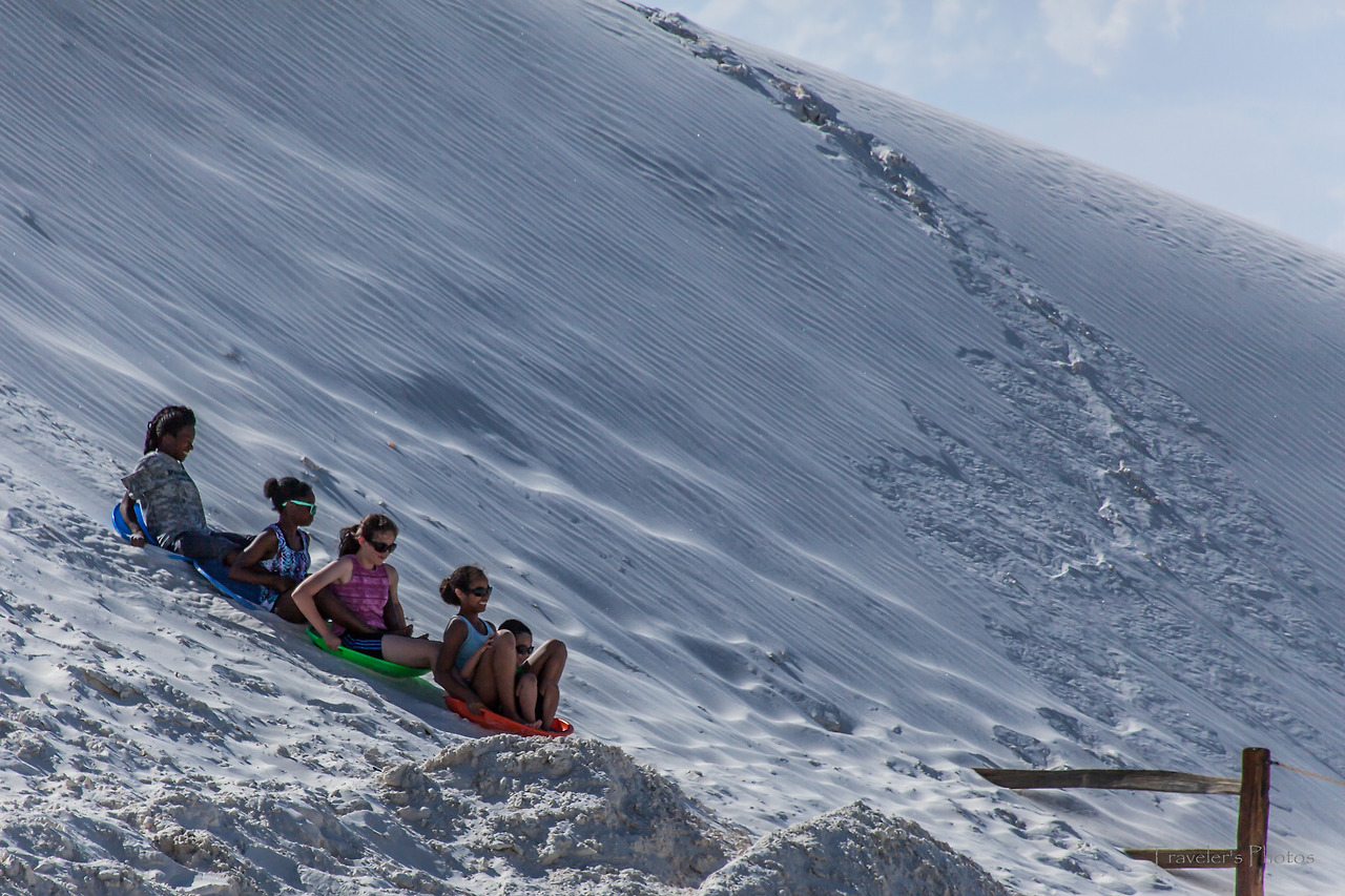 공원 안으로 들어갈수록 하양은 더욱 짙어지다가 결국 모든 것이 하얗게 되었다. 그 가운데 간간히 돋아난 덤불들, 그리고 고고하게 돋은 꽃 한 송이[참으로 놀랍지 않은가! 바람 한 번 훅 불면 모래 속에 묻히고 말 수도 있는 운명 이건만, 아랑곳하지 않고 굳건하게 꽃을 피워낸 저 생명이. 사막 생물을 볼 때마다 느끼는 것이지만, 한편으론 놀랍고 또 한편으로는 그들 앞에 서기가 한없이 부끄럽다. 언제나 부끄럽지 않게 그들 앞에 설 수 있을까!]만이 고고하게 유채색의 물질일 뿐, 모든 것이 무채색이다. 그 무채색 뒤로 병풍처럼 드리워져 있는 저 먼 산봉우리들과 지평선 너머로부터 시작된 푸르른 하늘, 그리고 그 하늘 사이로 점점이 마치 농담처럼 뭉클거리는 구름들, 그 사이를 바삐 넘실대는 세찬 바람과 모래 먼지가 한데 어우러져 비현실적인 풍경을 연출해 낸다. 하얀 빛깔은 구름의 춤사위에 따라 때로는 밝게, 때로는 옅게, 또 때로는 어둡게 스펙트럼을 만들더니 이내 섞바뀌어 다시 구름 사이로 비치는 햇살에 못 이겨 밝은 하양을 이룬다. 어느 순간 구름이 다시 햇살을 가리는 숨바꼭질이 이어지고, 천진한 아이들은 세상이야 어쨌든 상관없이 모래 썰매를 타느라 정신이 없다.