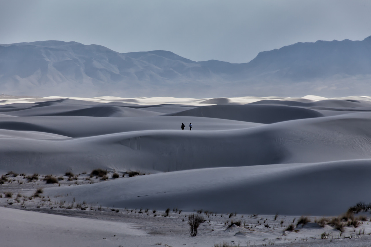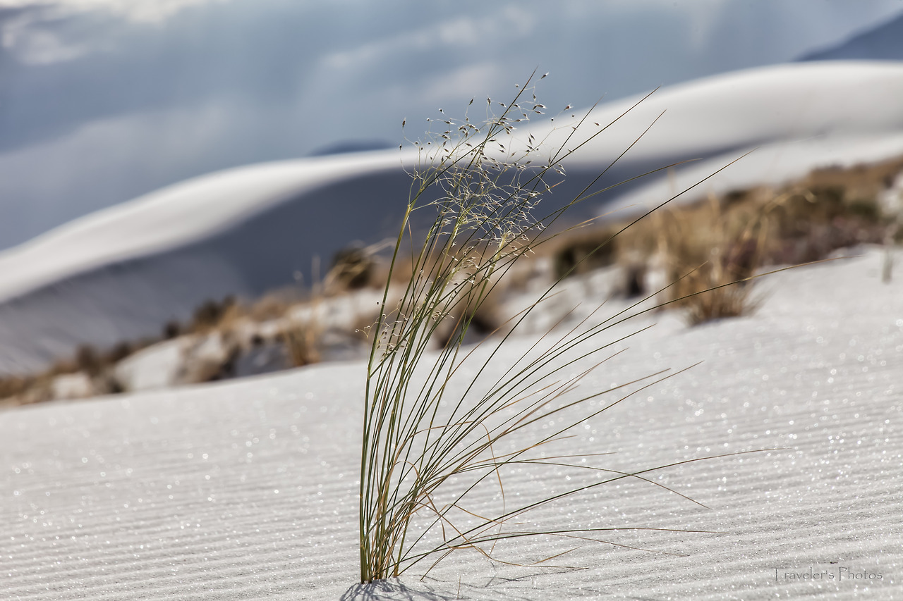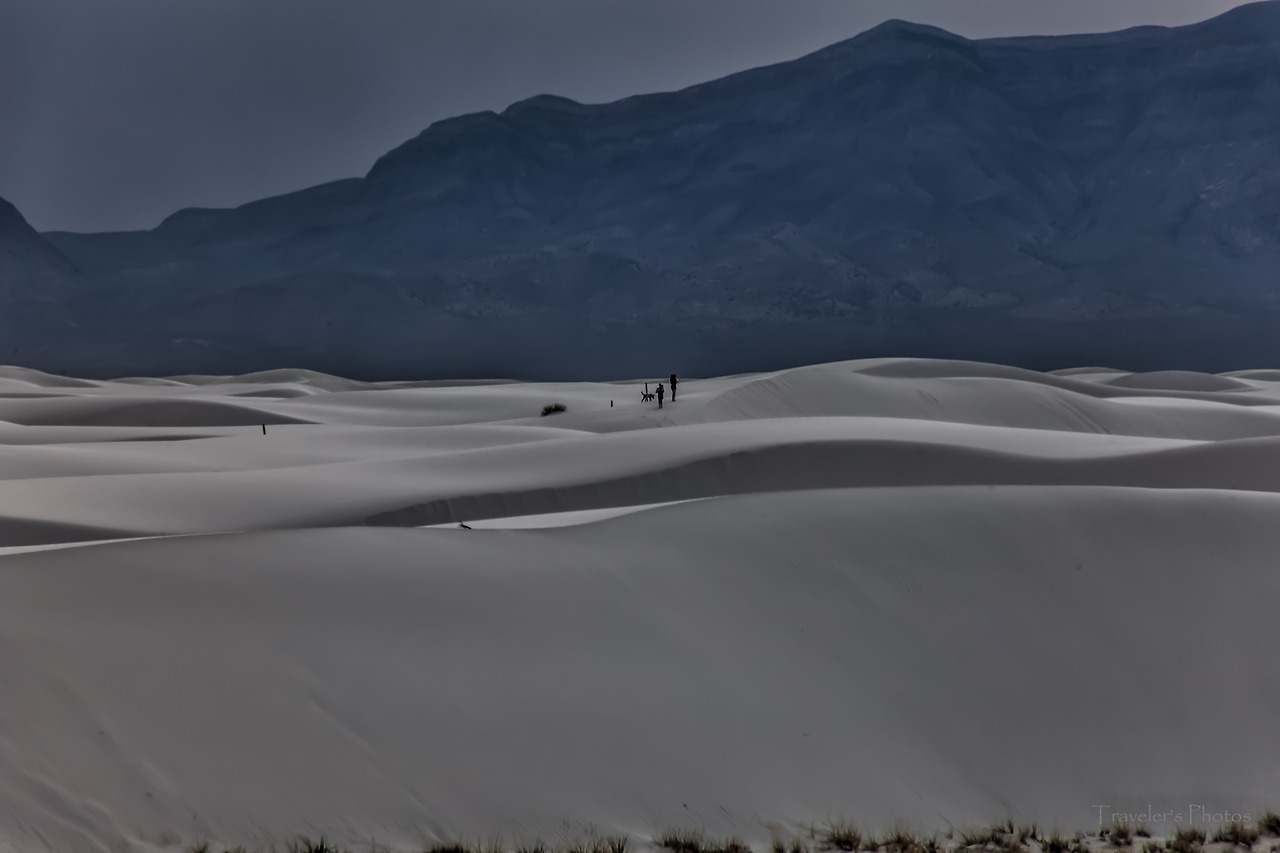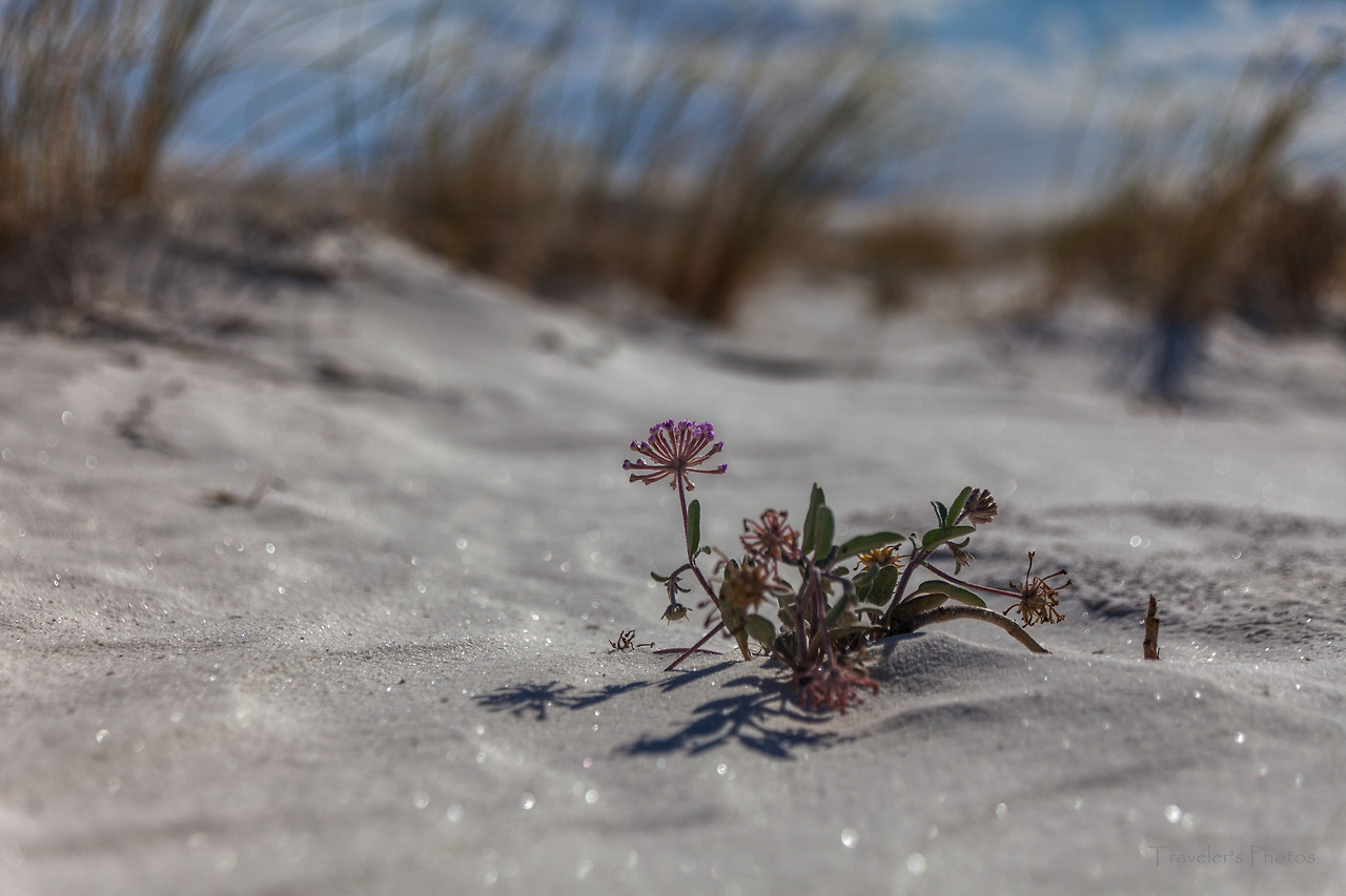 공원 안으로 들어갈수록 하양은 더욱 짙어지다가 결국 모든 것이 하얗게 되었다. 그 가운데 간간히 돋아난 덤불들, 그리고 고고하게 돋은 꽃 한 송이[참으로 놀랍지 않은가! 바람 한 번 훅 불면 모래 속에 묻히고 말 수도 있는 운명 이건만, 아랑곳하지 않고 굳건하게 꽃을 피워낸 저 생명이. 사막 생물을 볼 때마다 느끼는 것이지만, 한편으론 놀랍고 또 한편으로는 그들 앞에 서기가 한없이 부끄럽다. 언제나 부끄럽지 않게 그들 앞에 설 수 있을까!]만이 고고하게 유채색의 물질일 뿐, 모든 것이 무채색이다. 그 무채색 뒤로 병풍처럼 드리워져 있는 저 먼 산봉우리들과 지평선 너머로부터 시작된 푸르른 하늘, 그리고 그 하늘 사이로 점점이 마치 농담처럼 뭉클거리는 구름들, 그 사이를 바삐 넘실대는 세찬 바람과 모래 먼지가 한데 어우러져 비현실적인 풍경을 연출해 낸다. 하얀 빛깔은 구름의 춤사위에 따라 때로는 밝게, 때로는 옅게, 또 때로는 어둡게 스펙트럼을 만들더니 이내 섞바뀌어 다시 구름 사이로 비치는 햇살에 못 이겨 밝은 하양을 이룬다. 어느 순간 구름이 다시 햇살을 가리는 숨바꼭질이 이어지고, 천진한 아이들은 세상이야 어쨌든 상관없이 모래 썰매를 타느라 정신이 없다.