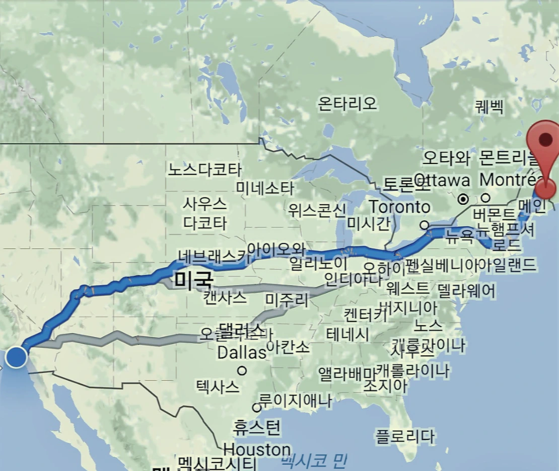 해당하는 메인(Maine) 주의 홀톤(Houlton)이라는 도시까지 거리가 3,300여 마일 나온다. 하루 밤에 1,000마일 갈 수 있으니, 3,000마일이면 지도에 표시된 대로 이틀이면 갈 수 있다. 그러나 이런 계산이 가당치도 않다는 것은 여러분도 이미 알고 계시리라. 사람이 기계가 아닌 다음에야 2시간 운전에 한 번씩 쉬어야 하고, 중간중간 주유도 해야 한다. 게다가 낮에 일하고 밤을 새워 운전한다는 것은 쉽지 않은 일이다.