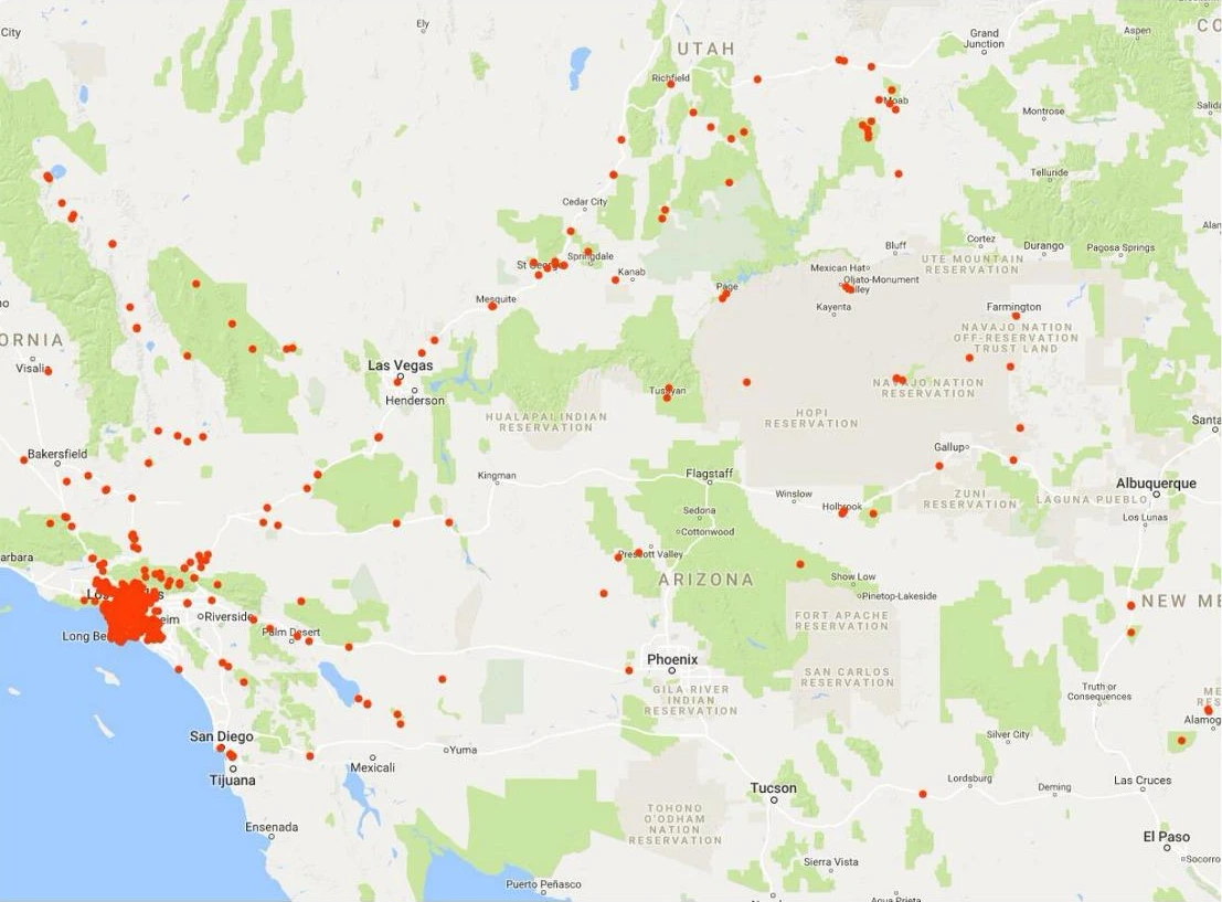 해 다녀온 여행을 구글맵을 통해 확인해 보니, 일정한 경계가 형성되어 있다. 자동차 여행을 하고, 주말에만 여행을 하다 보니 이런 한계가 생길 수밖에 없는 것 같다. 금요일 저녁에 출발해서 갈 수 있는 거리는, 밤을 새워 한숨도 자지 않고 간다고 가정하고, 저녁 6시에 출발해서 적어도 다음 날 아침 9시에는 도착해야 일정을 소화할 수 있으니, 15시간을 갈 수 있다. 그러면 주말여행으로도 최소한 1000마일 반경 안에 있는 여행지는 섭렵할 수 있다는 계산이 나온다. 자, 그러면 내가 사는 곳에서 반경 1000마일 안에 있는 곳이 어디인지 살펴볼까? 우와! 미국의 1/3 정도 구역을 주말여행으로 다녀올 수 있다는 계산이 나온다. 구글맵에서 확인해 봤다. 내가 사는 곳이 서쪽 끝 부분이니까 동쪽 끝에
