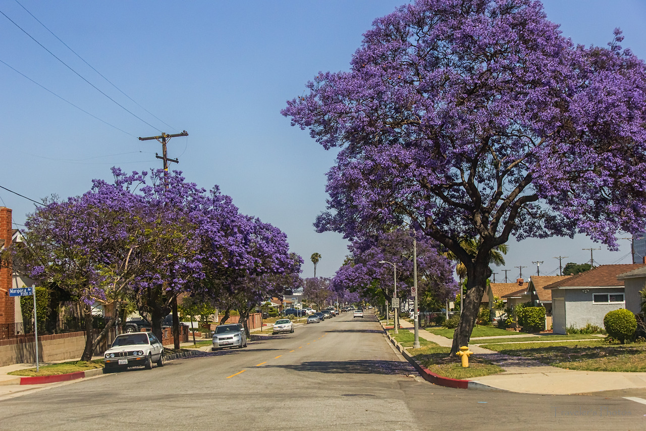 그러나 남가주에서 한국의 벚꽃처럼 자카란다가 대규모 군락지로 조성된 곳이 없어 좀 아쉽다. 지자체별로, 아니면 마을 단위로, 그것도 아니면 개별적으로 거리에 심거나 집 앞 뜰에 심은 정도다. 그런데도 어딜 가나 흔히 볼 수 있을 만큼 많은 사랑을 받고 있다. 자카란다의 꽃잎은 통 꽃잎이라 꽃이 지면 커다란 꽃잎이 떨어진다. 이 말은 자카란다가 지기 시작해도 꽃비가 내리지는 않는다는 말이다.