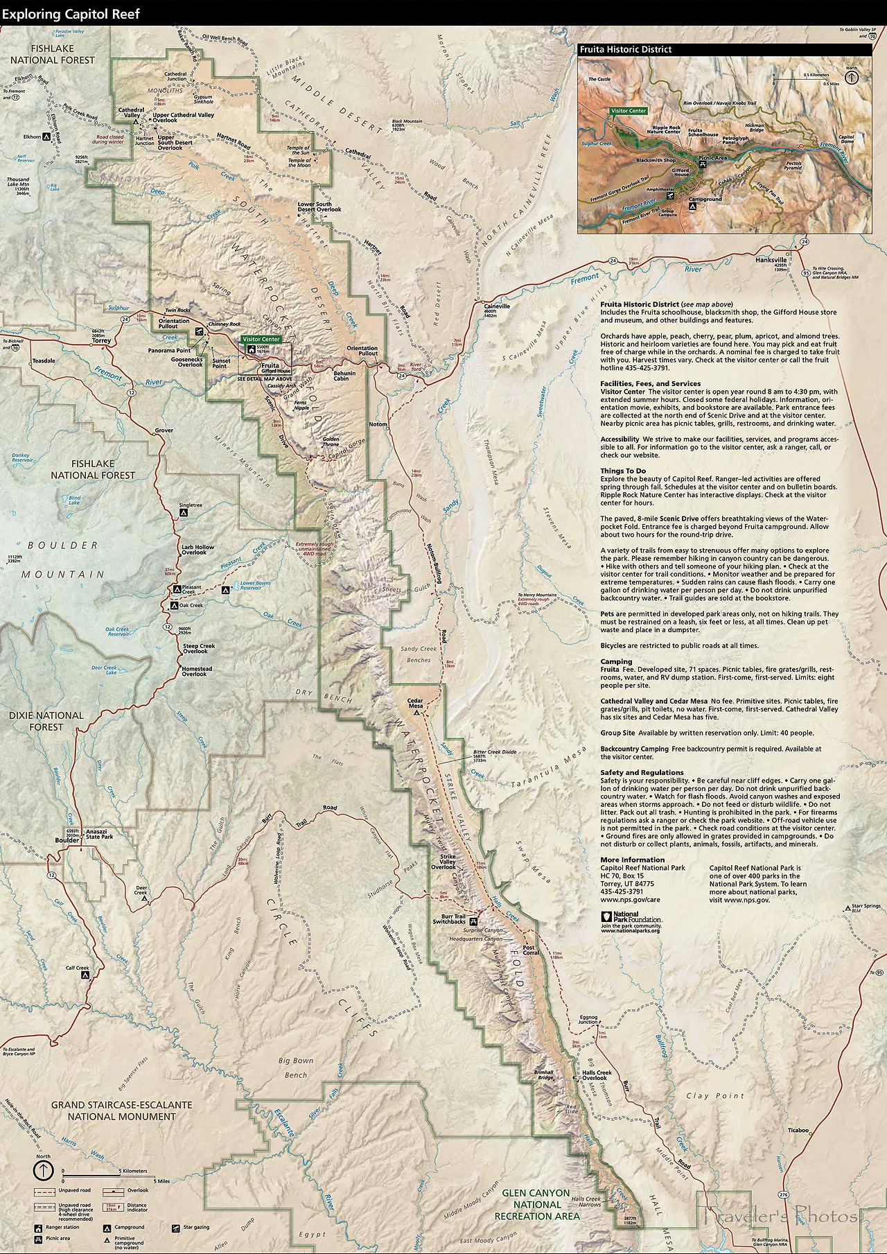 캐피톨 리프 국립공원은 면적만 본다면 유타주의 국립공원 가운데 캐년 랜즈 다음으로 넓다. 넓은 대신 폭이 좁고 길이가 긴 형태를 띠고 있는데, 공원을 관통하는 도로는 동서로 난 도로가 유일하다. 이 길 중간 즈음에 방문자 센터가 있고, 캠프 그라운드도 있고, 과수원도 있다.